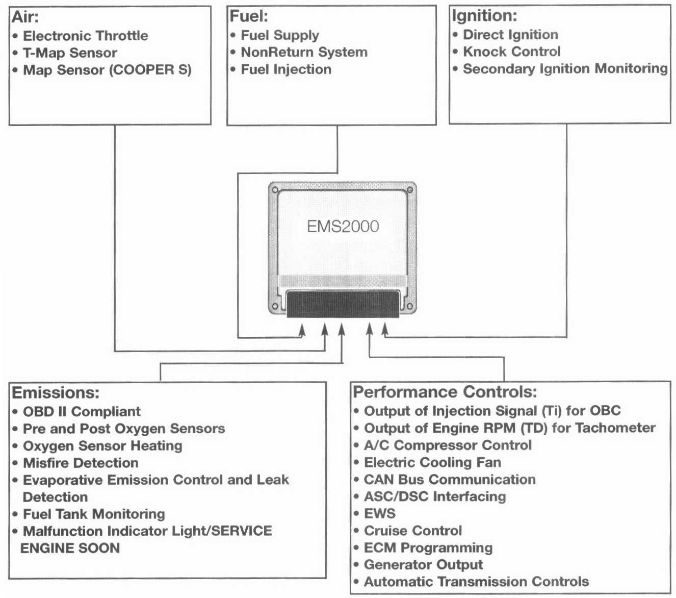Using these inputs the Engine Management System makes operating decisions and outputs control signals to manage engine, transmission and emission operation.