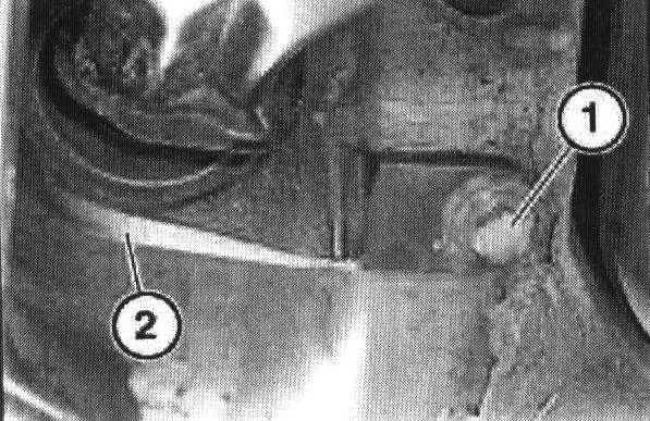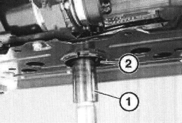Remove bolts (1) securing engine lower stabilizer (2) and remove.