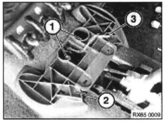 Remove nuts (1) securing front centre console mounting bracket (2) to body, feed cigar lighter/power socket connector (3) through bracket and remove.