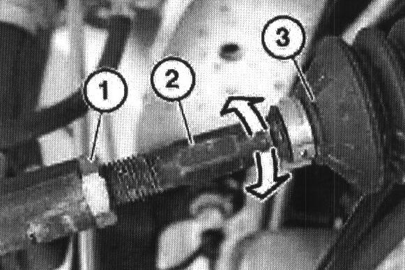 Adjust wheel toe in to specified value by turning tie rod at hexagon head (2).