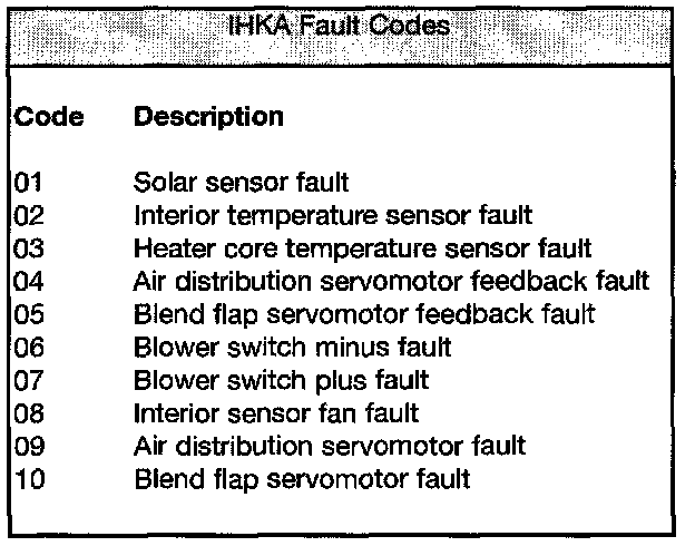 The IHKA fault memory is read and displayed in the central display panel. If no faults are present 00 is displayed and if a fault is stored FF followed by a code number is displayed. This display flashes at 0.5 Hz.