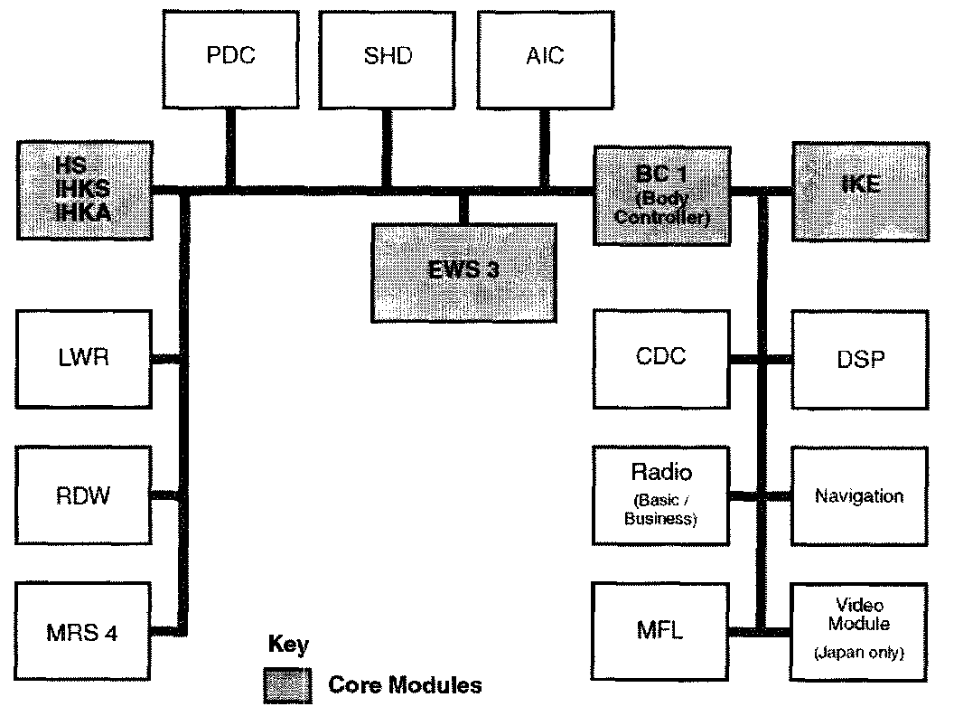 Information from a single sensor is passed on to many control units reducing the number of sensors needed, (e.g. Raw vehicle speed is received at the DSC unit which uses this information for unit operation and a processed road speed is sent to the IKE over the CAN-Bus. The IKE converts this signal into a K-bus message and transmits this via the K-bus to the BC1 for the speed dependent wiper control and the radio for the speed dependent volume adjustment).