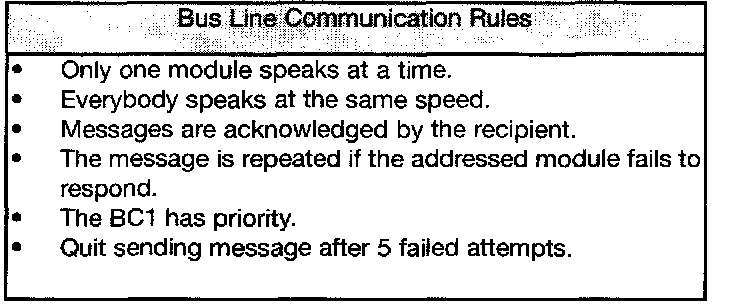 Arbitration on the K-bus is controlled by the sender of the message. Each sender has an allocation priority. The body control module (BC1) has the highest priority on the K-bus system and messages from the BC1 override any other K-bus message which has been transmitted simultaneously