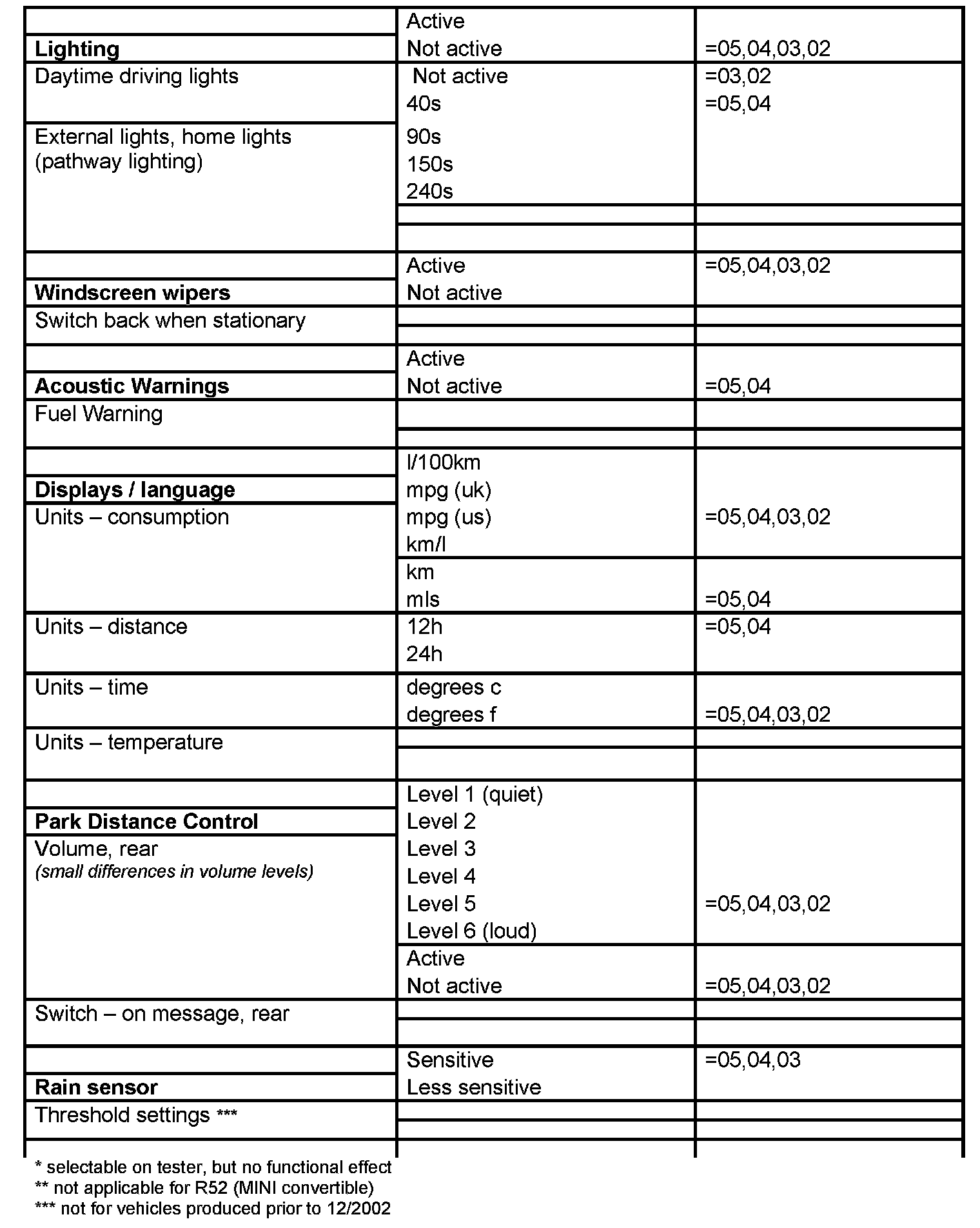 "*" - sign indicates factory default (when present vehicle selection is different)