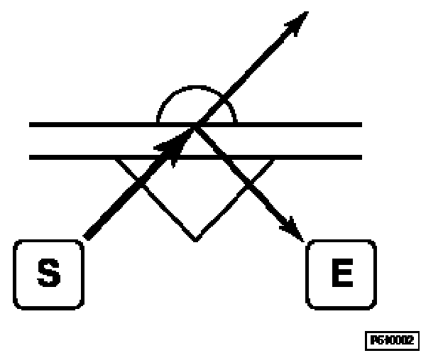 When the windshield is dry, all infrared beams which are emitted by the infrared diodes "S" and which hit the windshield at a defined angle are reflected in full by the windshield and therefore reach the infrared receivers "E" also in full.
