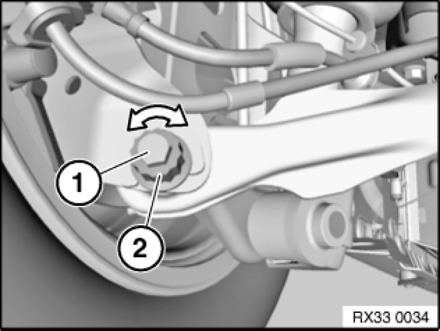 - Adjust camber by turning eccentric disk (2) in direction of max. positive (wheel at bottom is at max. in relation to center of car)