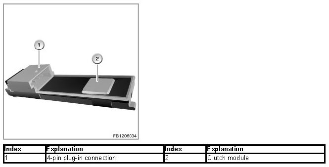 On vehicles with manual gearboxes, the clutch module at the clutch pedal picks up the clutch position (clutch pressed: clutch switch open; clutch not pressed, clutch switch closed). The clutch module consists of a clutch switch and an electronic evaluation unit.