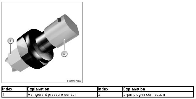 The refrigerant pressure sensor for the air conditioning system is located in the pressure line of the refrigerant circuit. In the cooling mode the refrigerant high pressure is picked via the pressure sensor are evaluated in the DME.