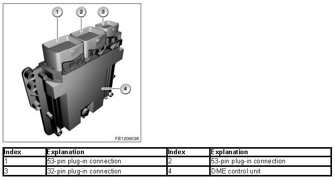 The DME control unit is connected with the vehicle electrical system via the engine wiring harness and vehicle wiring harness (3 connector chambers).