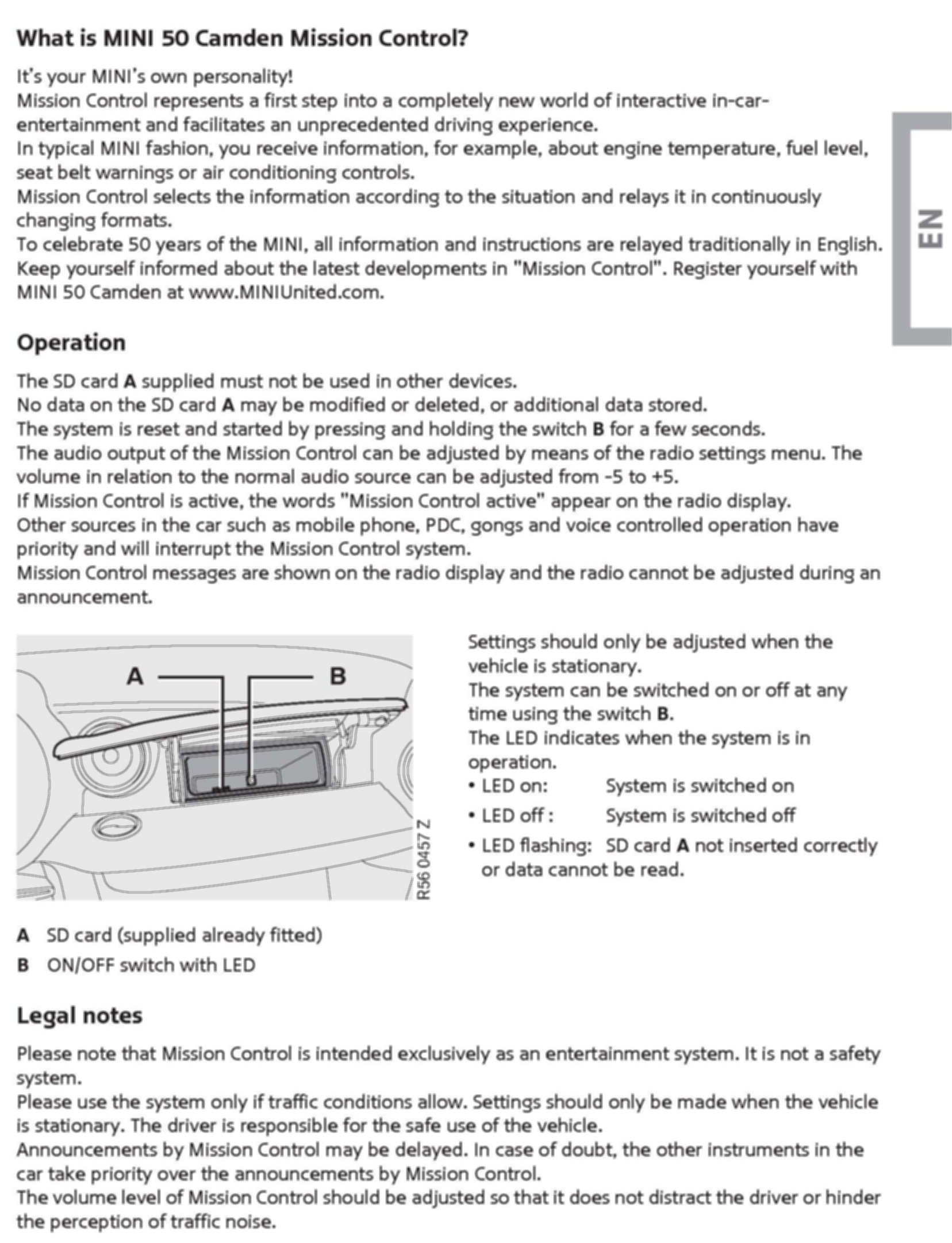 The Mission Control system provides the driver with a variety of advice, as well as situation-related, environmental, and car condition information, in a typically entertaining MINI way. The feature gives the driver the impression of directly interacting with the vehicle, and gives the vehicle its own personality.