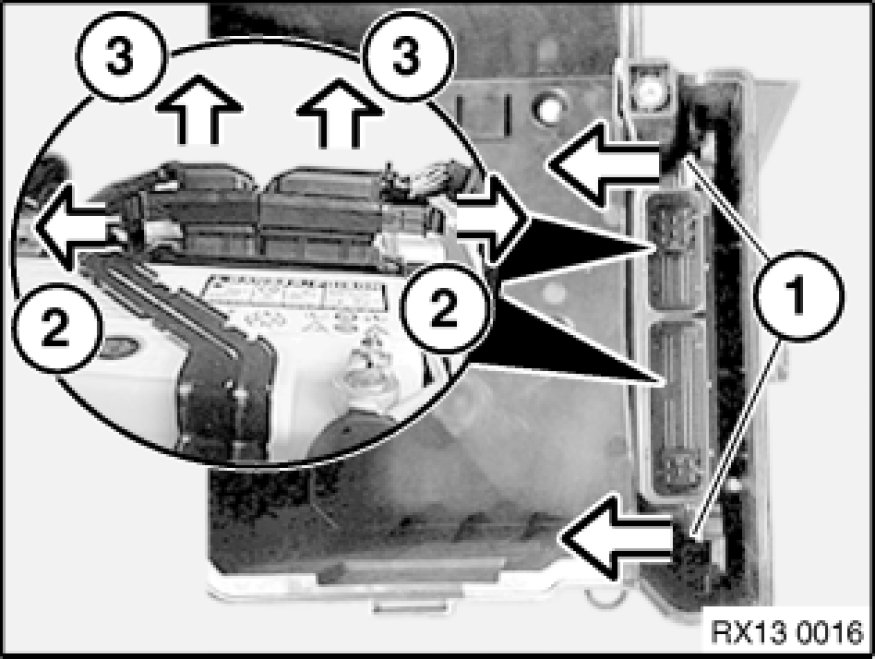 Release clips (1) and lift out DME control unit.