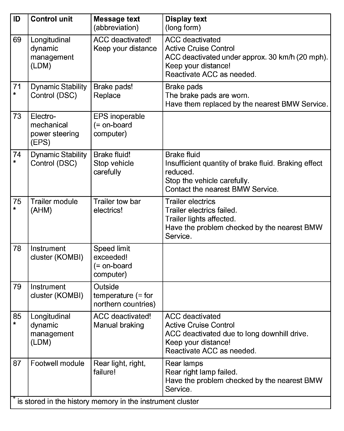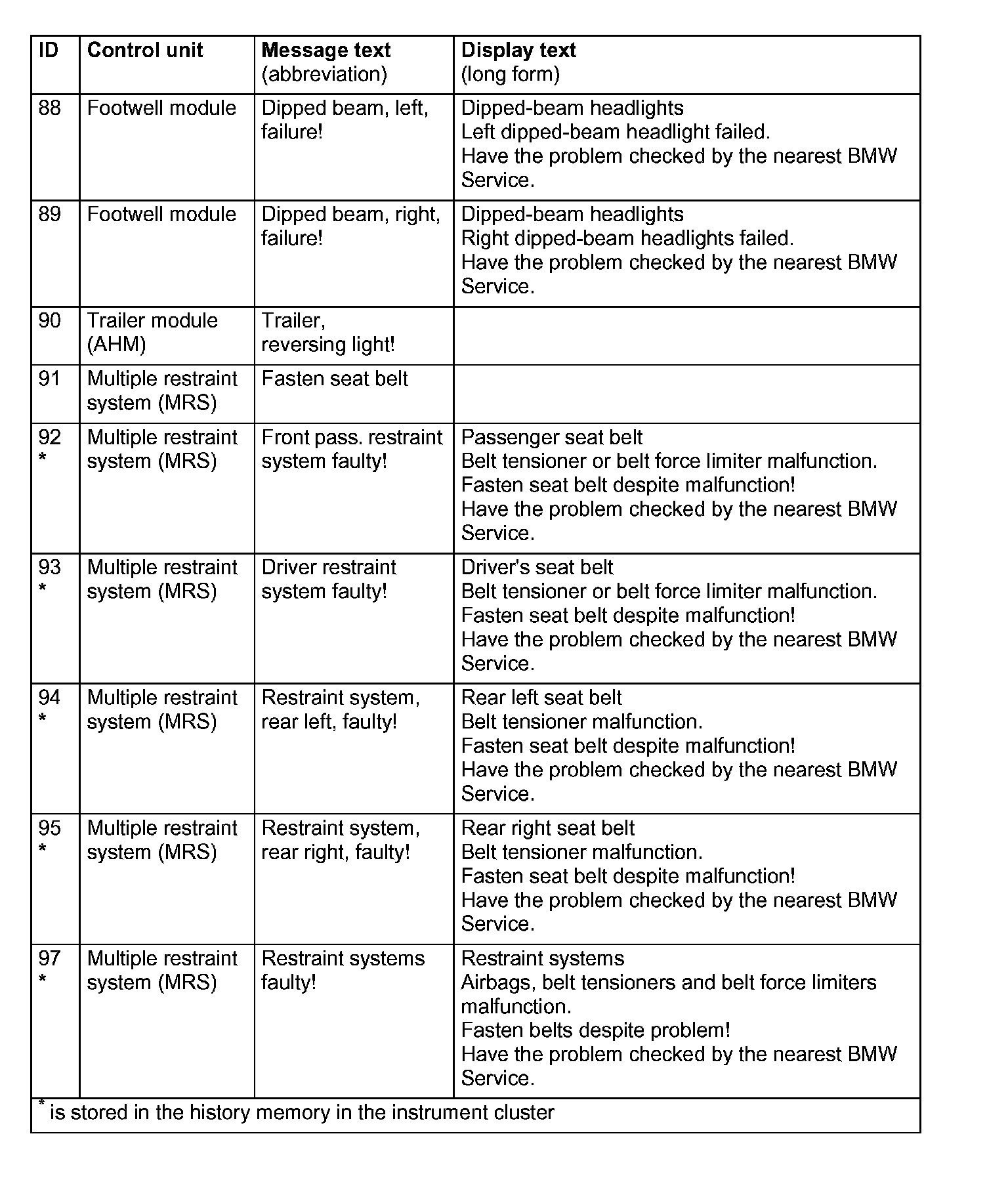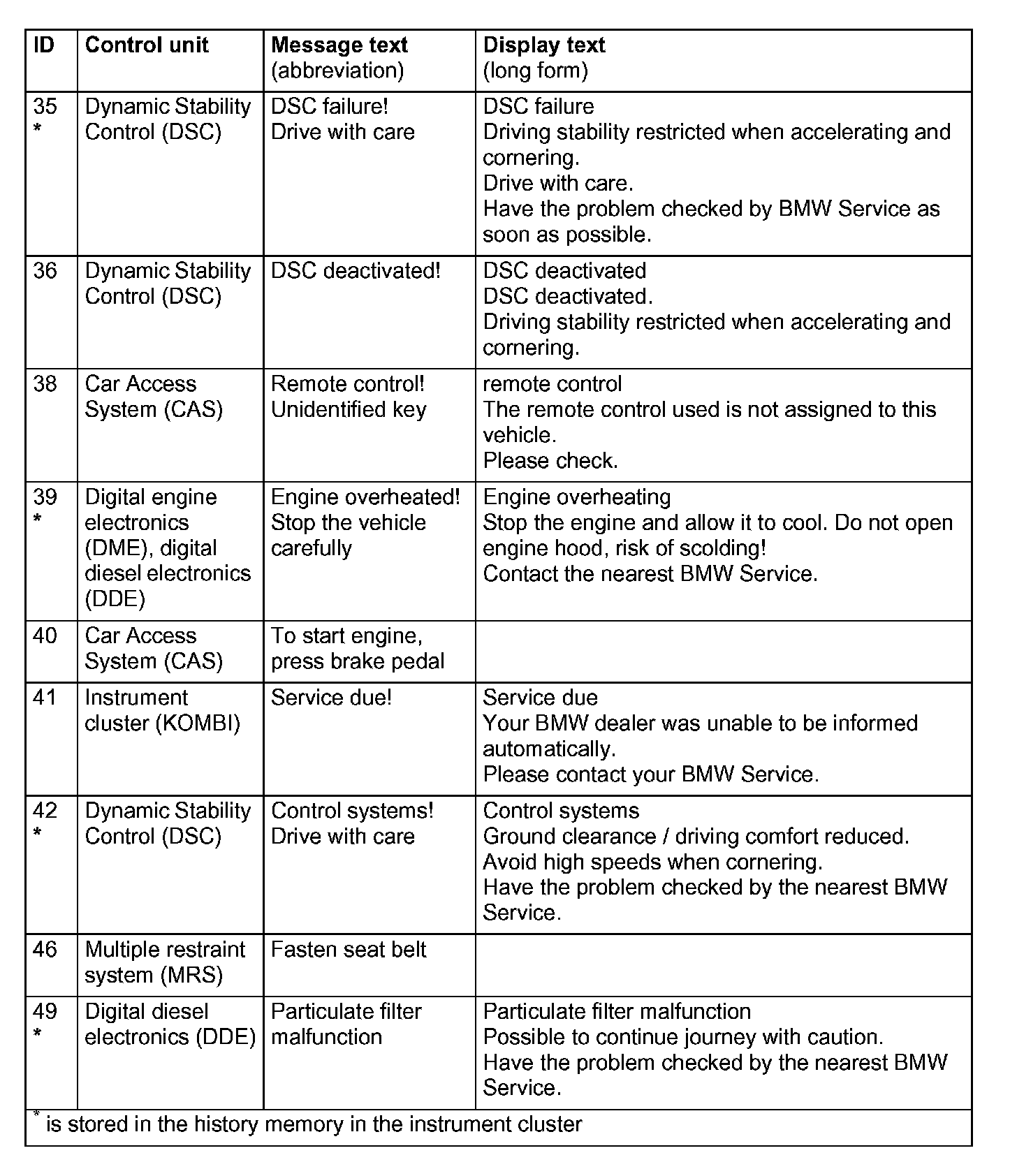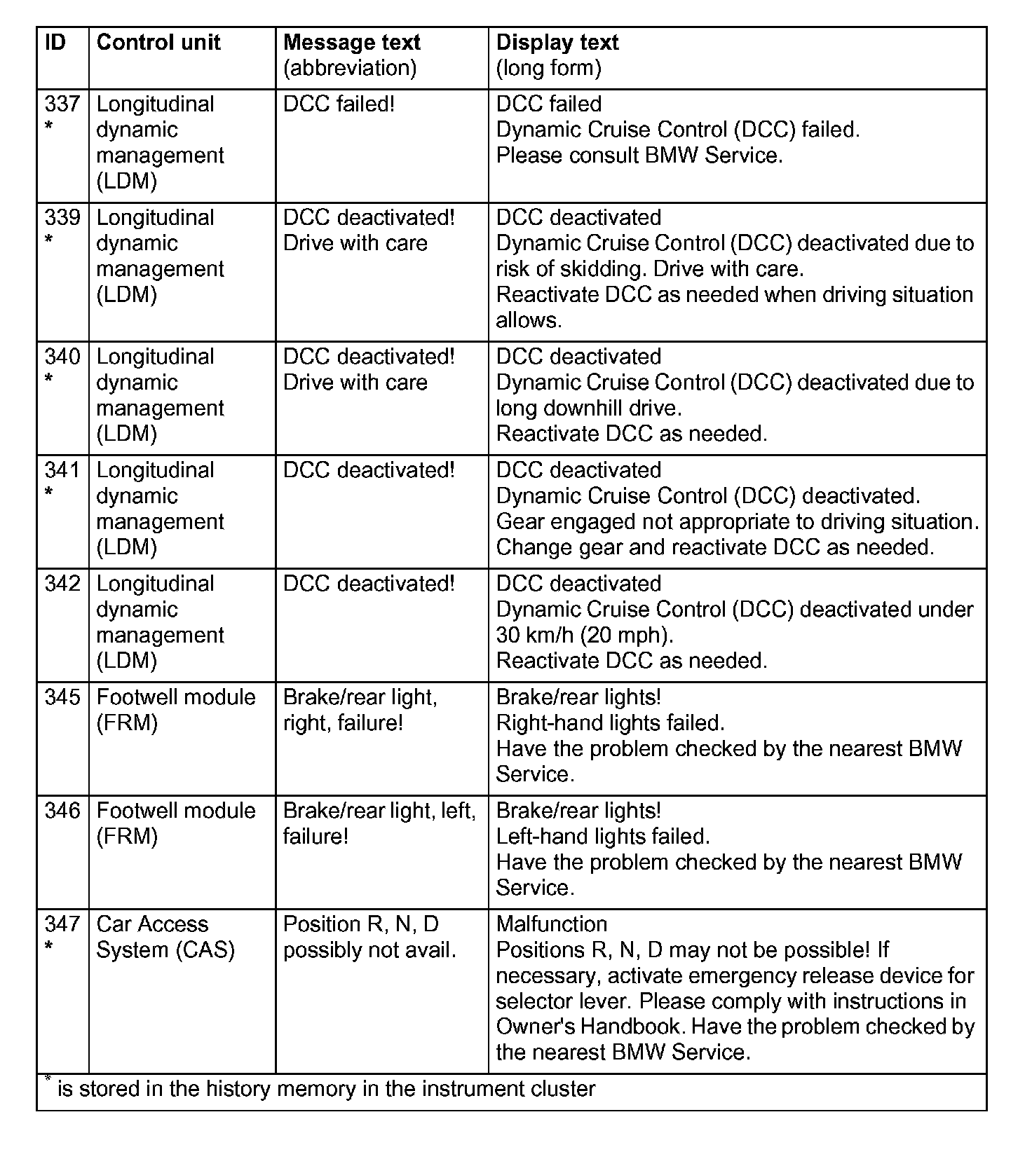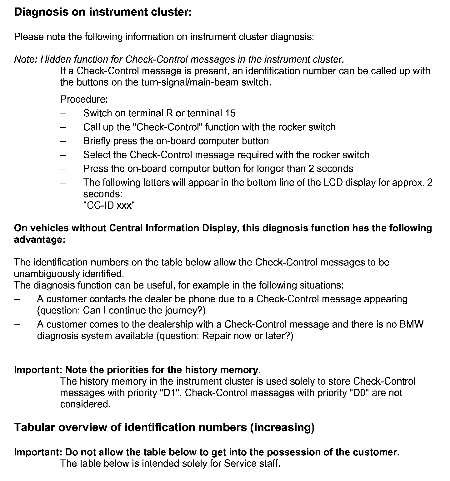 In situations where the customer complains of a check control (CC) message, but the message is currently not displayed, the last (72) CC messages are stored in the instrument cluster and can be viewed using DIS V49.0, or later. (Note: Only important messages are stored. Messages concerning e.g. door open, are not stored.)