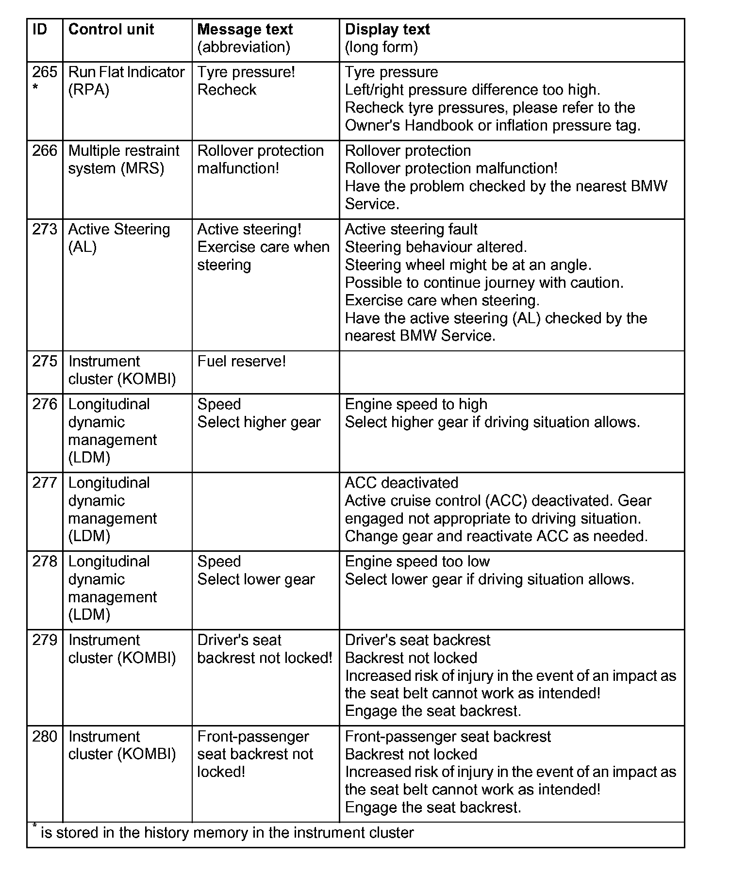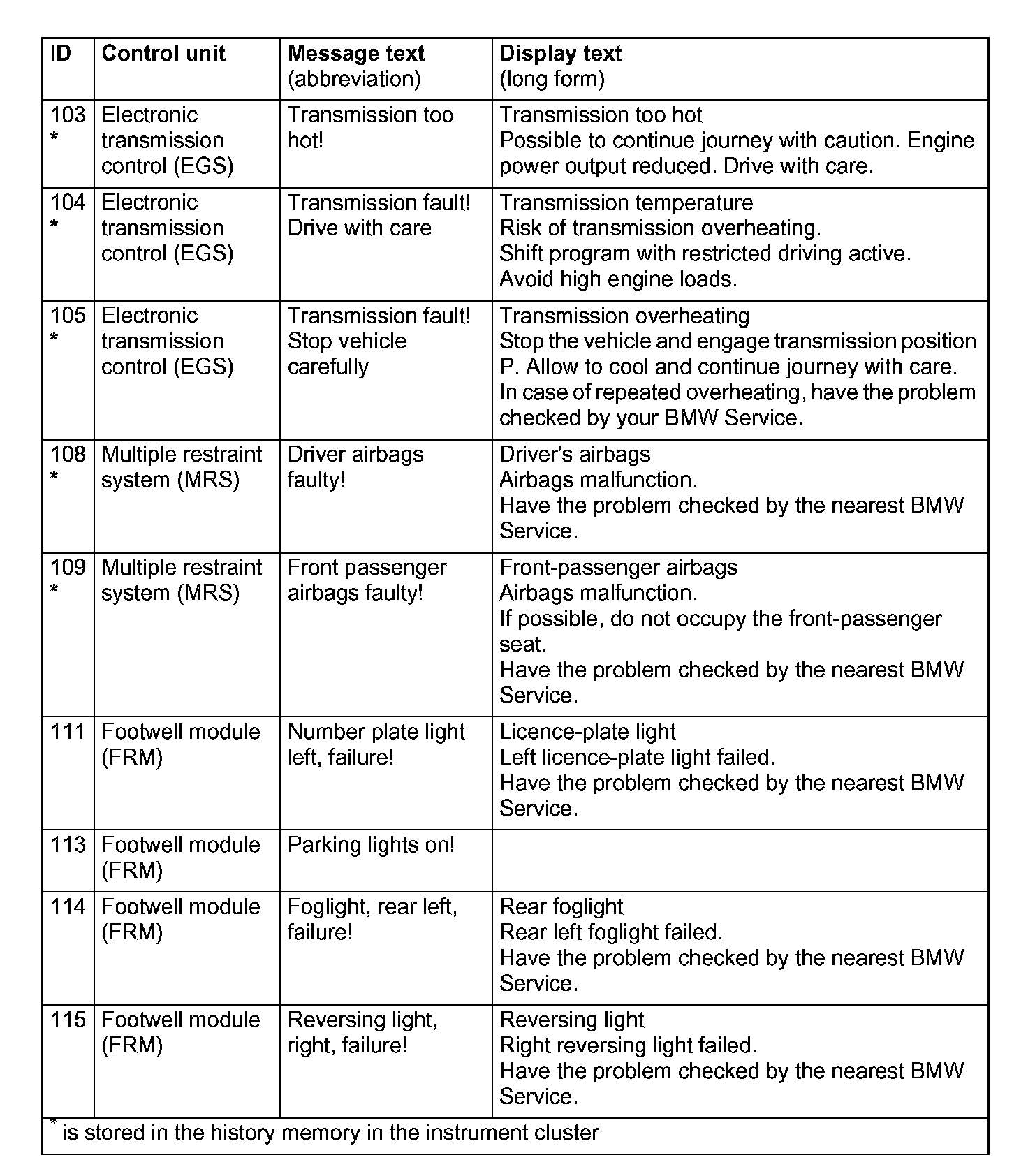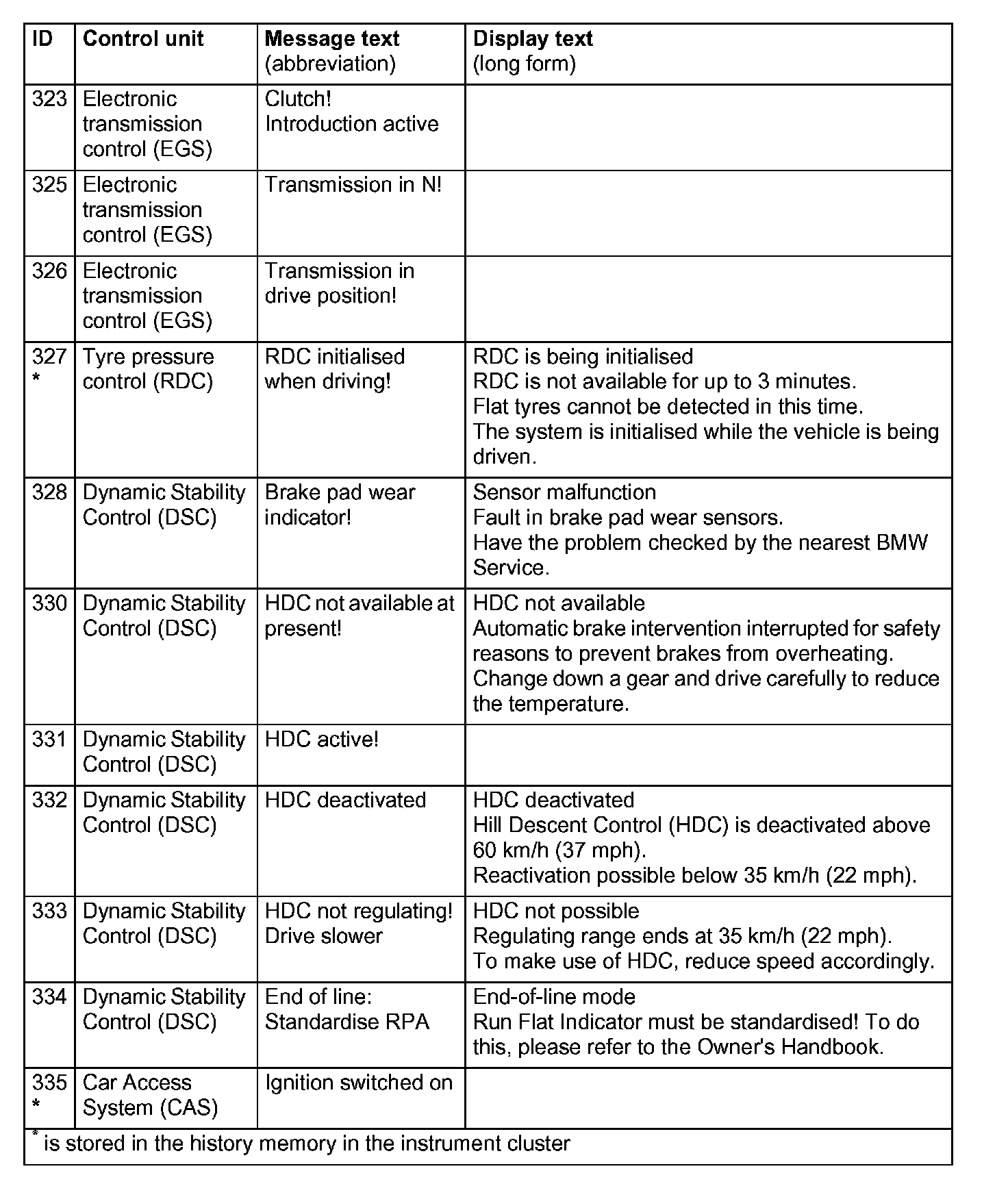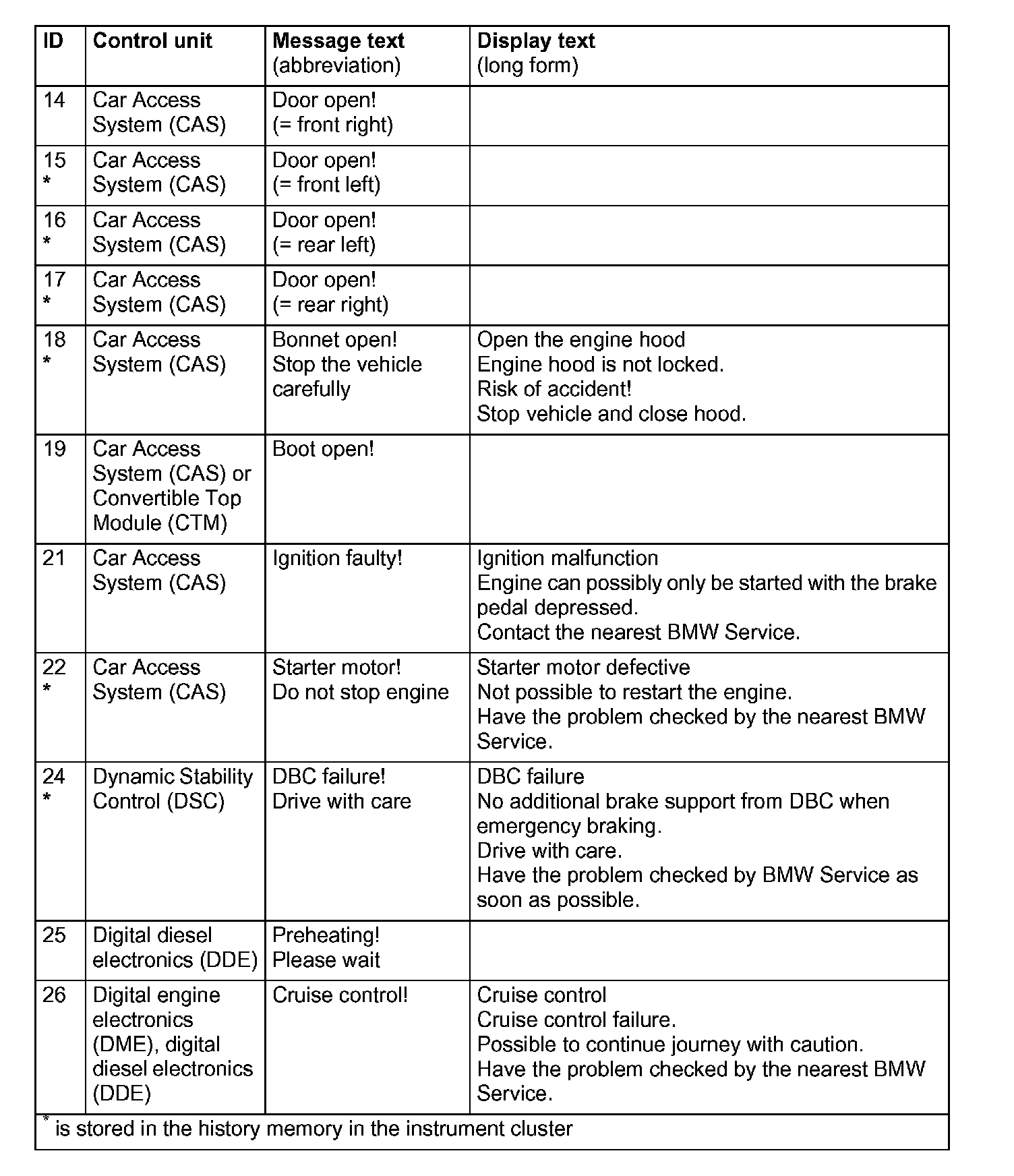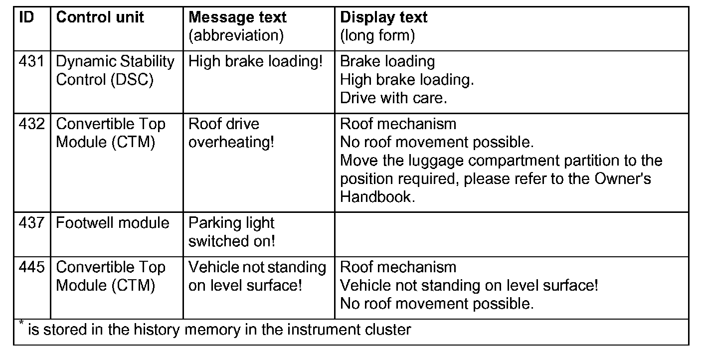 In situations where the customer complains of a check control (CC) message, but the message is currently not displayed, the last (72) CC messages are stored in the instrument cluster and can be viewed using DIS V49.0, or later. (Note: Only important messages are stored. Messages concerning e.g. door open, are not stored.)