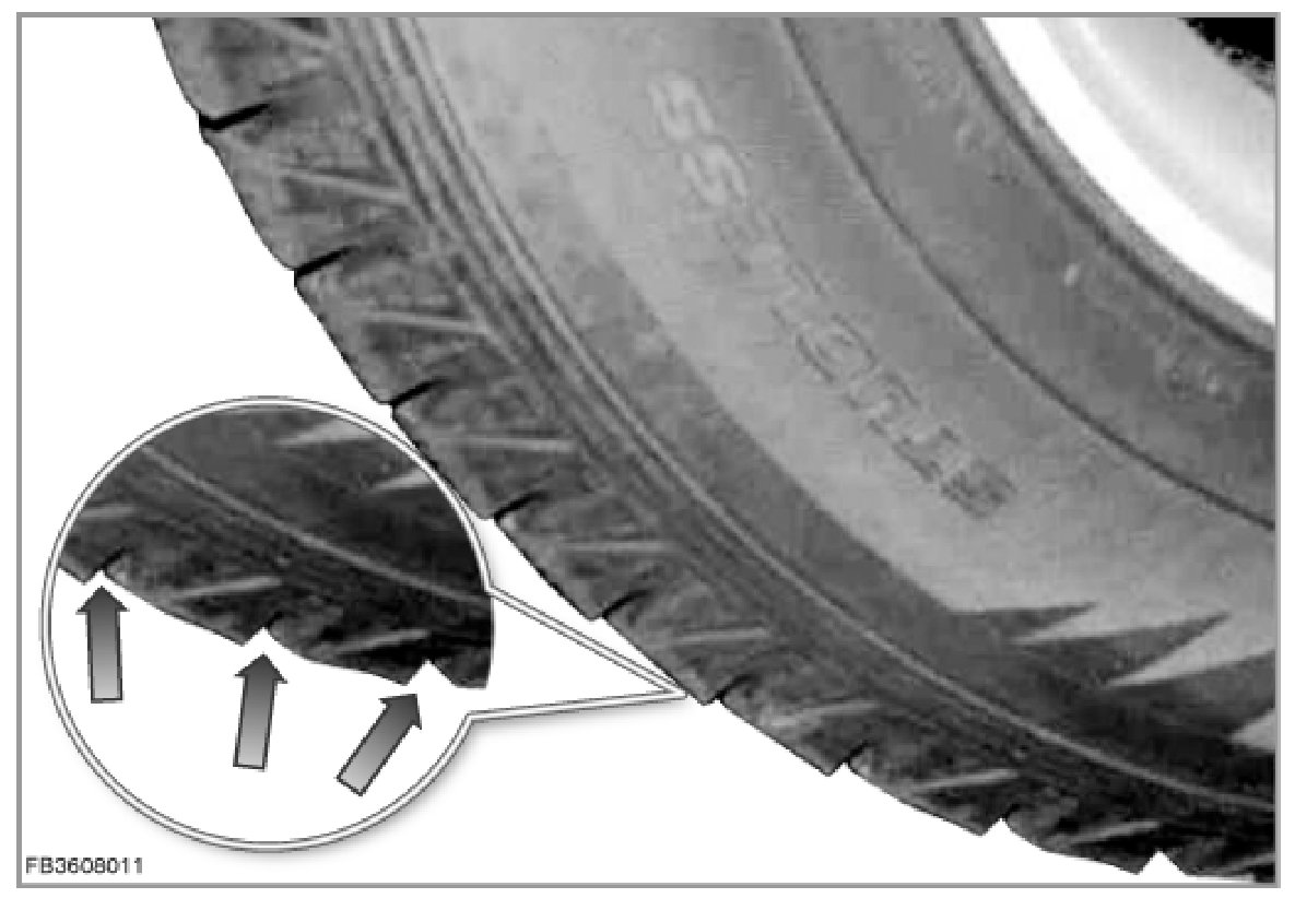 In some cases, saw-toothed wear can be observed on the front tyres of rear-driven vehicles. The individual cleats of the tread wear down due to the slip that occurs when the vehicle rises from the road surface as inner tensions are discharged. Saw-toothed wear can lead to increased running noise.