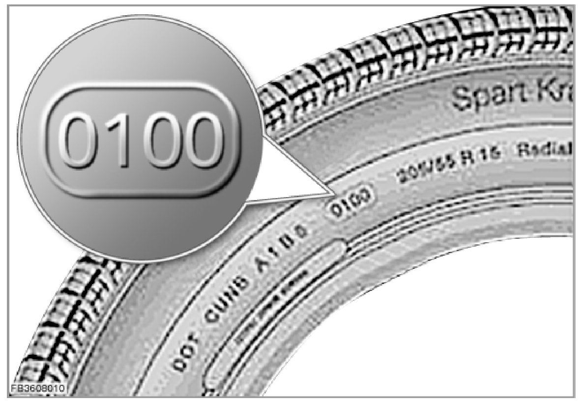 Tyres as of date of manufacture week 01 in the year 2000 have a four-digit DOT number. DOT 0100 (see illustration) indicates that the tyre was manufactured in the 1st calendar week of 2000.
