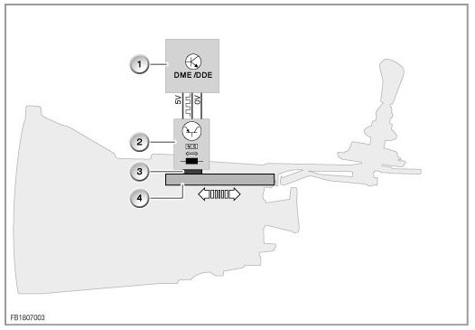 On vehicles with manual gearboxes, the zero gear sensor is fitted on the transmission case. The zero gear sensor is a PLCD sensor, which means the sensor detects a linear change in the location (excursion) without contact on the basis of position changes with regard to the magnetic state. The gearshift operation shifts the selector rod (4) and thus the magnet in the gearbox. The PLCD sensor enables the engine management system to detect the position of the gear-stick. The following illustrations show the schema of the assembly and sectional views of the sensor attached to the gearbox: