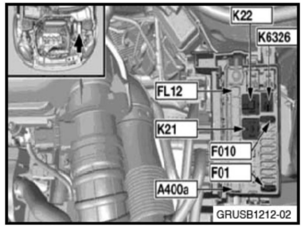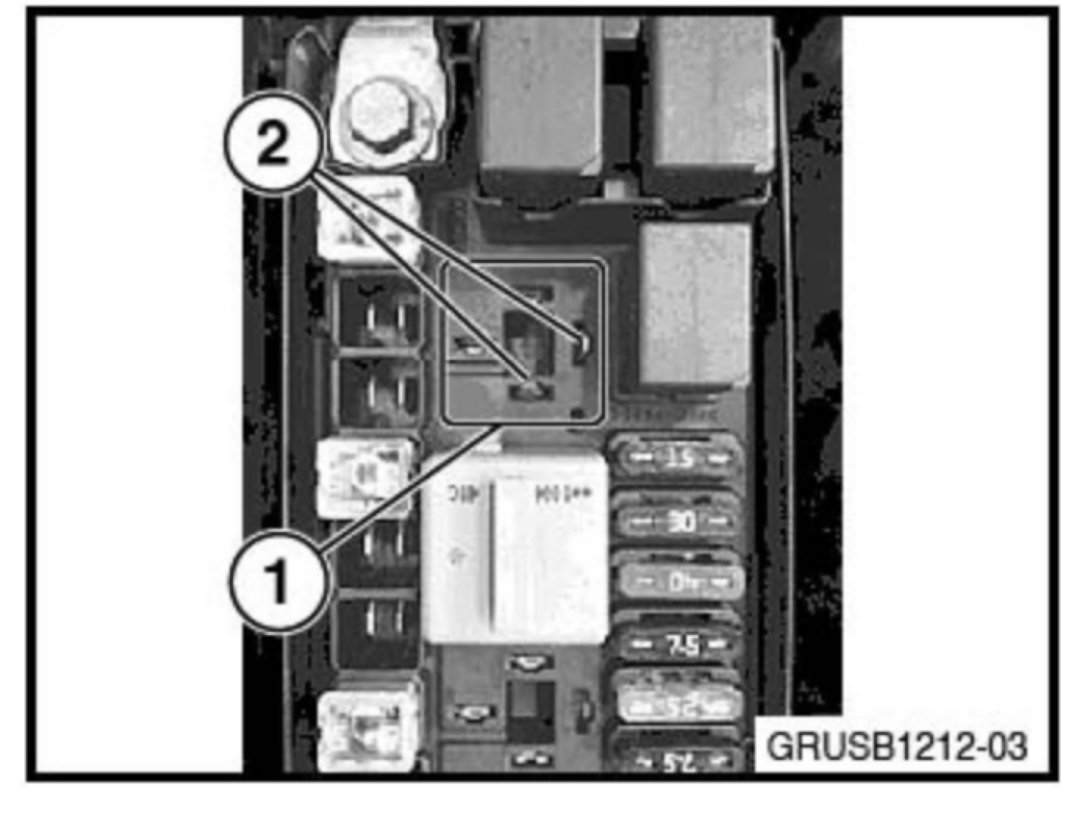 Connect battery charger Remove electric fan relay K22 (1) Insert Special Tool P/N 61 31 1 379 817 to activate the cooling fan. Make sure that the contacts bridge the two terminals shown in the illustration (2). The tool will activate the fan by connecting terminal 87 and 30 of the relay connector. For additional information refer to SI M04 14 12.