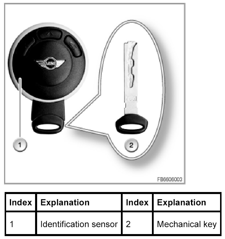 To switch the terminal and/or start the engine, the identification sensor only needs to be located in the vehicle interior (not in the mounting). On the R56, the luggage compartment is part of the inside of the vehicle. In principle, the necessary authentication runs in the same way as for Passive Entry (only via the vehicle interior aerials). If there is no identification sensor inside the vehicle when the START-STOP button is pressed: Check Control message in the instrument cluster. Pressing the START-STOP button switches the terminals. The order is as follows: 0 -> terminal R -> terminal 15 -> terminal R -> 0.