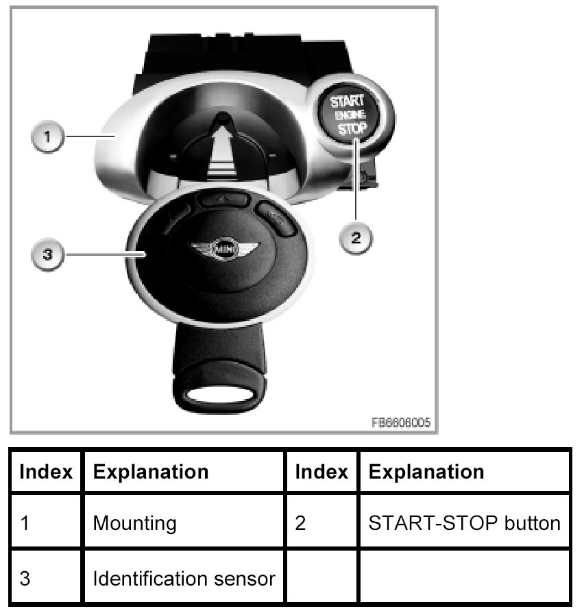 To switch the terminal and/or start the engine, the identification sensor only needs to be located in the vehicle interior (not in the mounting). On the R56, the luggage compartment is part of the inside of the vehicle. In principle, the necessary authentication runs in the same way as for Passive Entry (only via the vehicle interior aerials). If there is no identification sensor inside the vehicle when the START-STOP button is pressed: Check Control message in the instrument cluster. Pressing the START-STOP button switches the terminals. The order is as follows: 0 -> terminal R -> terminal 15 -> terminal R -> 0.