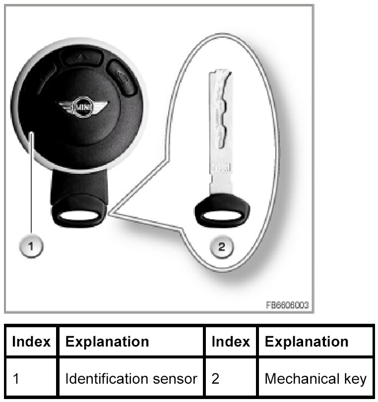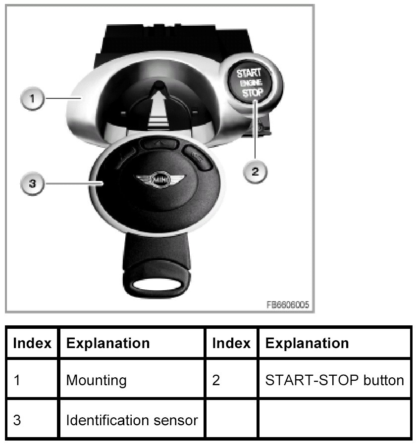To switch the terminal and/or start the engine, the identification sensor only needs to be located in the vehicle interior (not in the mounting). On the R56, the luggage compartment is part of the inside of the vehicle. In principle, the necessary authentication runs in the same way as for Passive Entry (only via the vehicle interior aerials). If there is no identification sensor inside the vehicle when the START-STOP button is pressed: Check Control message in the instrument cluster. Pressing the START-STOP button switches the terminals. The order is as follows: