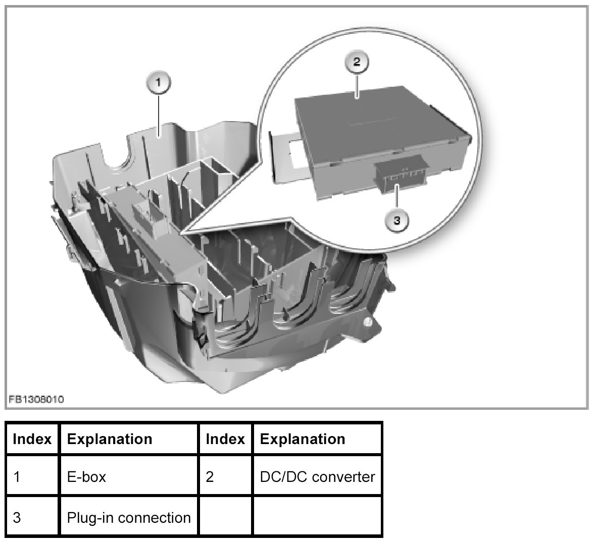 The DC/DC converter is fitted in the E-box in the engine compartment.