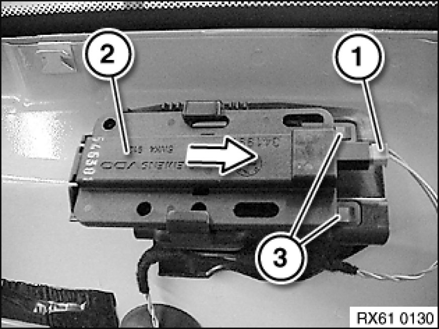 Unlock catches (3) and remove interior antenna for comfort access system (2) in direction of arrow from holder.