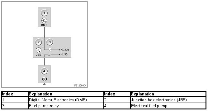 The electric fuel pump is an in-tank pump. The fuel pump relay activates the electric fuel pump. The DME control unit monitors the activation of the fuel pump relay. The fuel pump relay is controlled via a safety circuit only when the engine is running and shortly after terminal 15 ON for pressure build-up (delivery line for fuel pump). The fuel pump relay is in the junction box.
