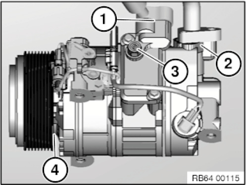 Check the sealing surface between the refrigerant pressure sensor (1) and the refrigerant line (2).
