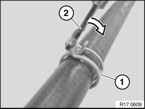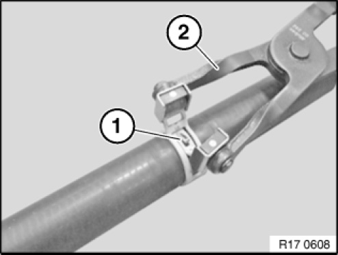 Loosen spring strap (1) with the pliers (2).