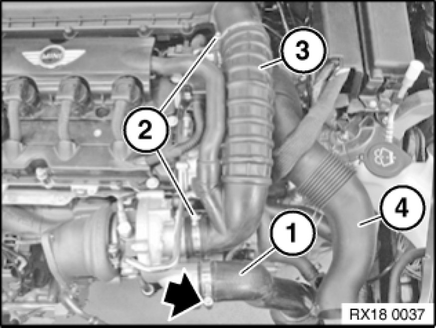 Gaiter and charge-air hoses with clamp fastenings must be installed dry and free from grease!