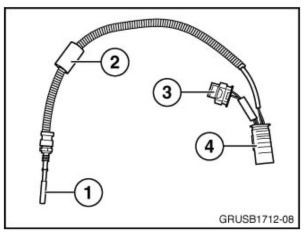 The improved sensor (P/N 13 62 8 603 908) includes the temperature probe (1) and insulating sleeve (2), a two-pin female connector (3) for the map thermostat, and a four-pin connector (4) for the engine harness.