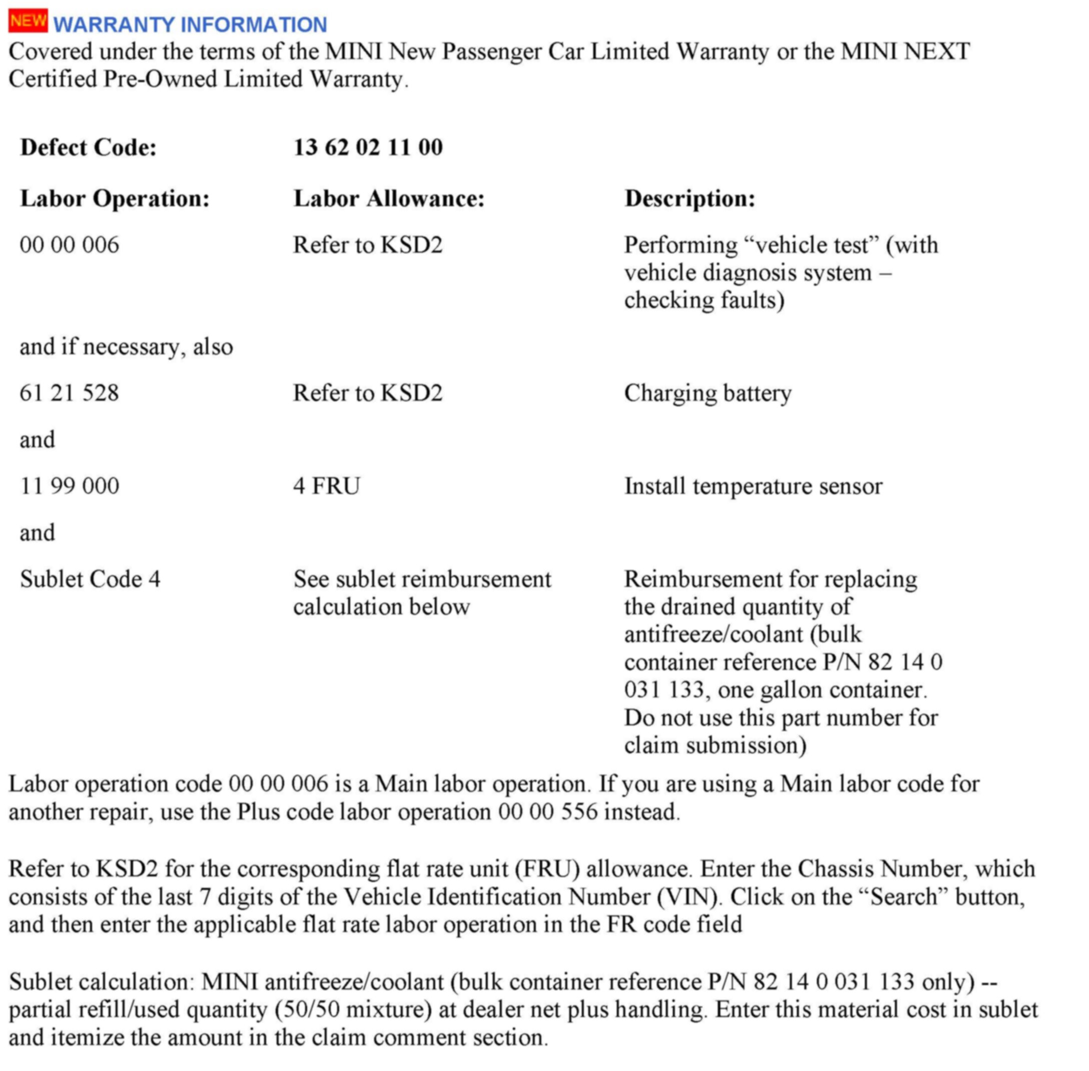 This repair procedure involves draining a small quantity of coolant; refill the drained quantity with new MINI Long-term Antifreeze/Coolant (50/50 mixture). Do not reuse the drained coolant.