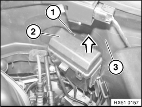 Unlock catch (1) and remove relay carrier/fuse box (2) in direction of arrow from bulkhead (3).