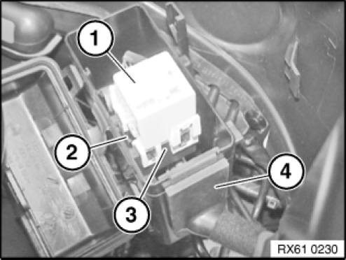 Unlock catch (2) and remove relay receptacle (3) with wiring harness (4) in upward direction.