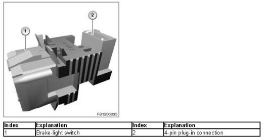 Two switches are built into the brake-light switch: the brake-light switch and the brake-light test switch (redundancy for safety reasons). The signals indicate to the DME control unit whether the brake pedal has been pressed.