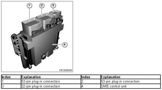 The DME control unit is connected with the vehicle electrical system via the engine wiring harness and vehicle wiring harness (3 connector chambers).