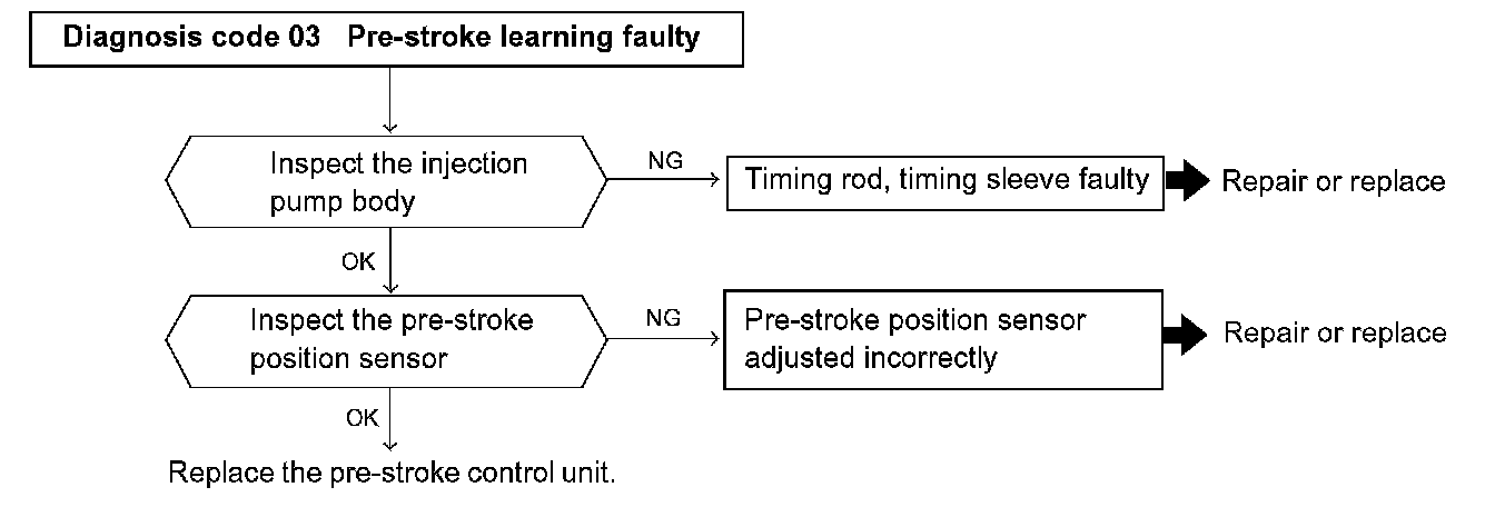 When diagnosis code 03 is indicated, inspect the injection pump body and the pre-stroke position sensor. However, special tools and equipment are necessary for this work, so it is recommended that the work be carried out by a ZEXEL service station. If the inspection result shows normal, replace the pre-stroke control unit.