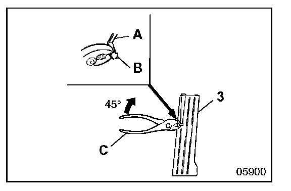 Pinch hook B of stopper A of accelerator pedal 3 using pliers C and rotating approximately 45° pull out the stopper towards the front of the vehicle.