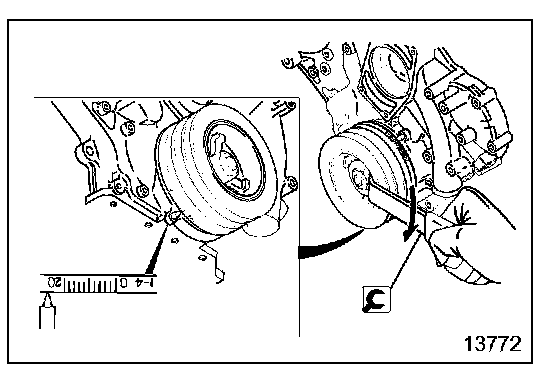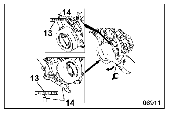 - Make sure that indent 13 on the crankshaft pulley and pointer 14 on the timing gear case show the standard fuel injection timing.