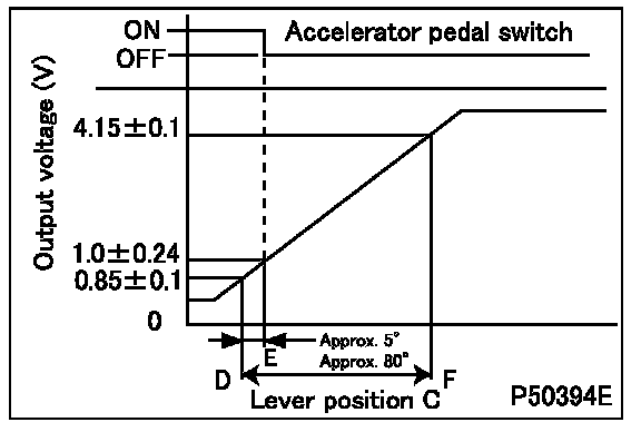 - Measure the output voltage at terminals 2 and 5 (sensor 1) and the output voltage at terminals 1 and 2 (sensor 2) with the accelerator lever in each specified position.
