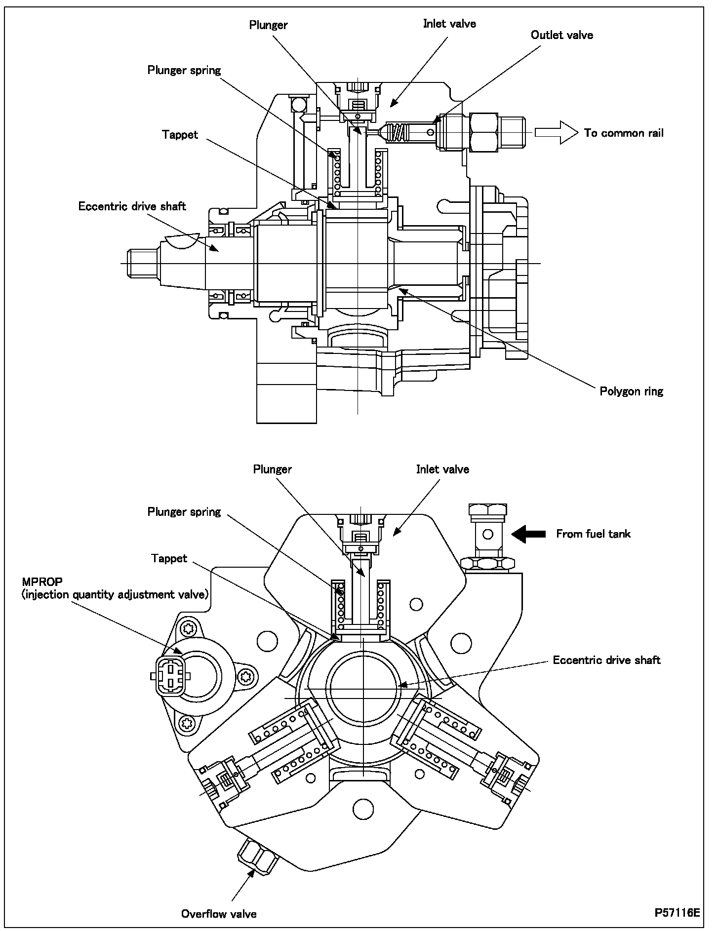 - Fuel drawn from the fuel tank by the feed pump is not supplied directly to the plungers. It is supplied first to the MPROP (injection quantity adjustment valve), which controls the amount of fuel reaching the plungers.
