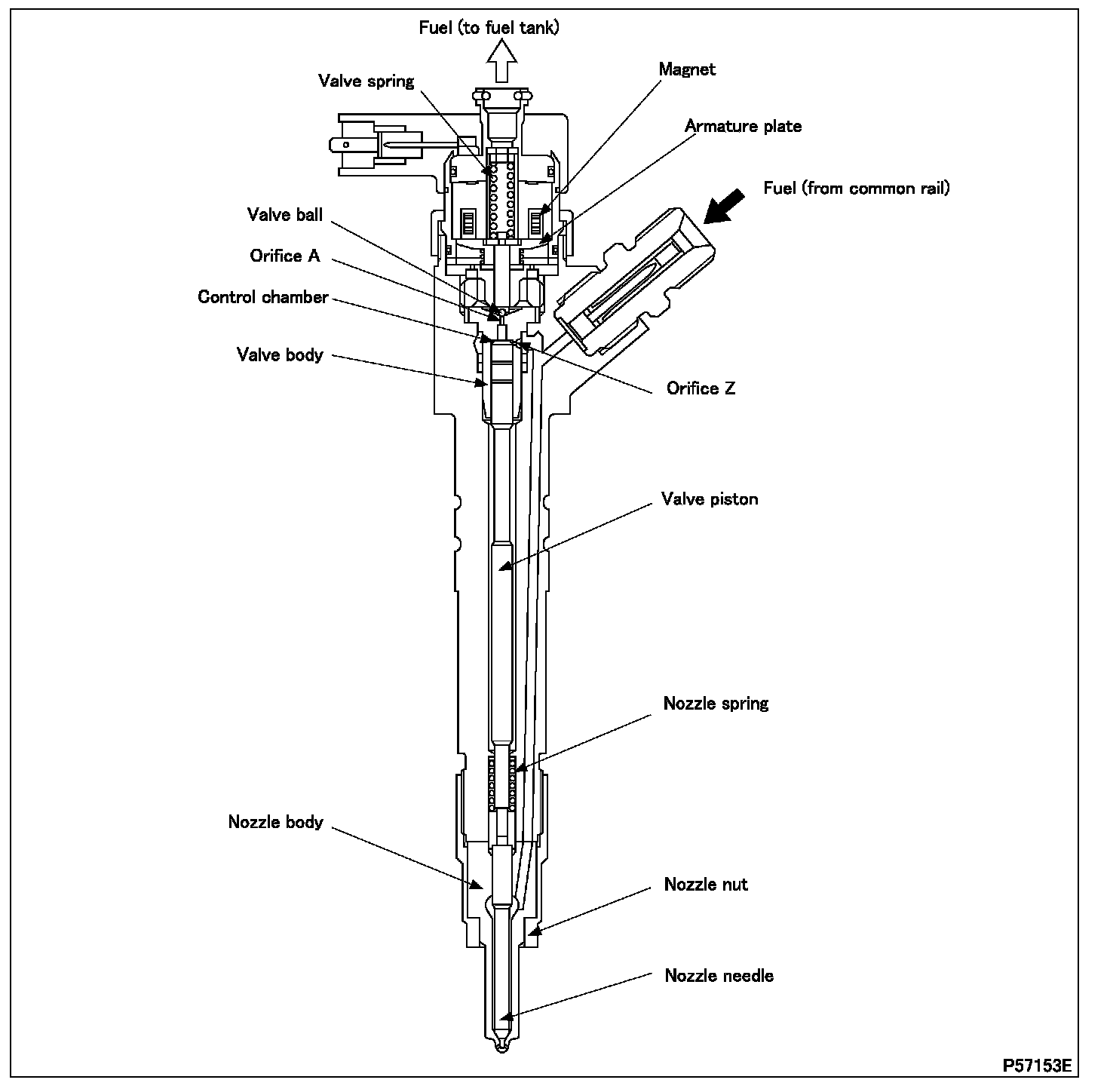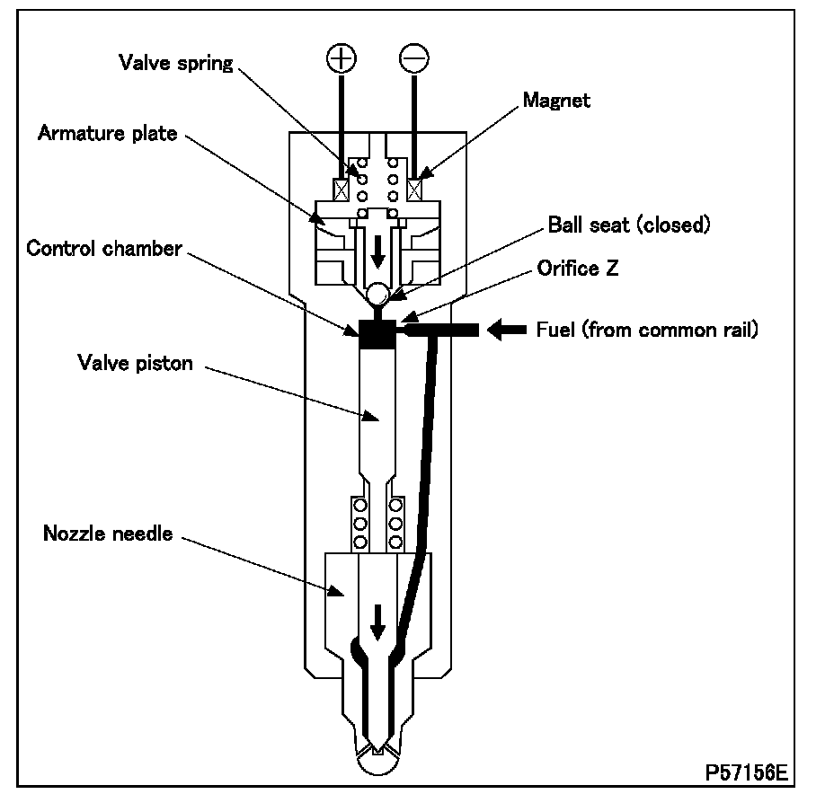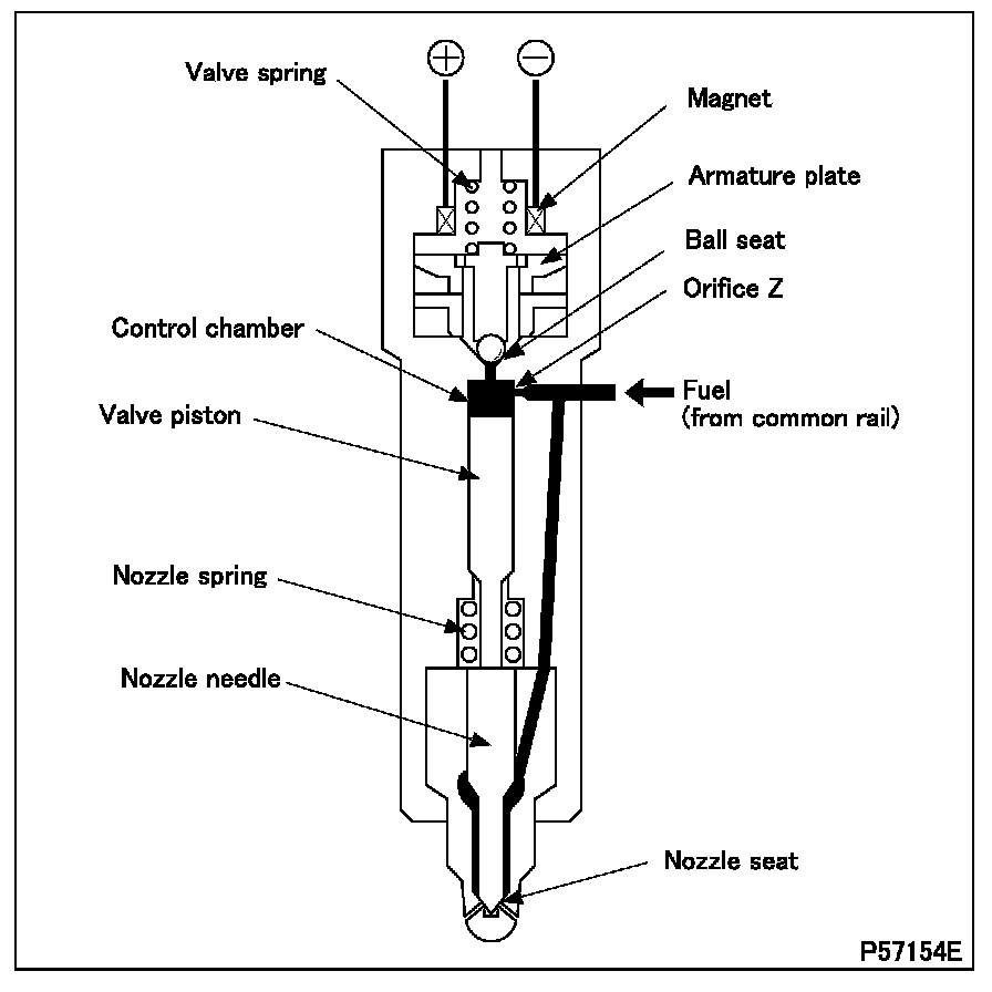 - When energization of the magnet is stopped, the armature plate is pushed downward by the valve spring such that the ball seat closes. At this time, fuel flows into the control chamber via orifice Z, pushing down the valve piston and nozzle needle such that injection finishes.