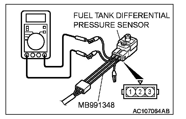 1. Disconnect the fuel tank differential pressure sensor connector and connect special tool MB991348 between the terminals of the disconnected connector.