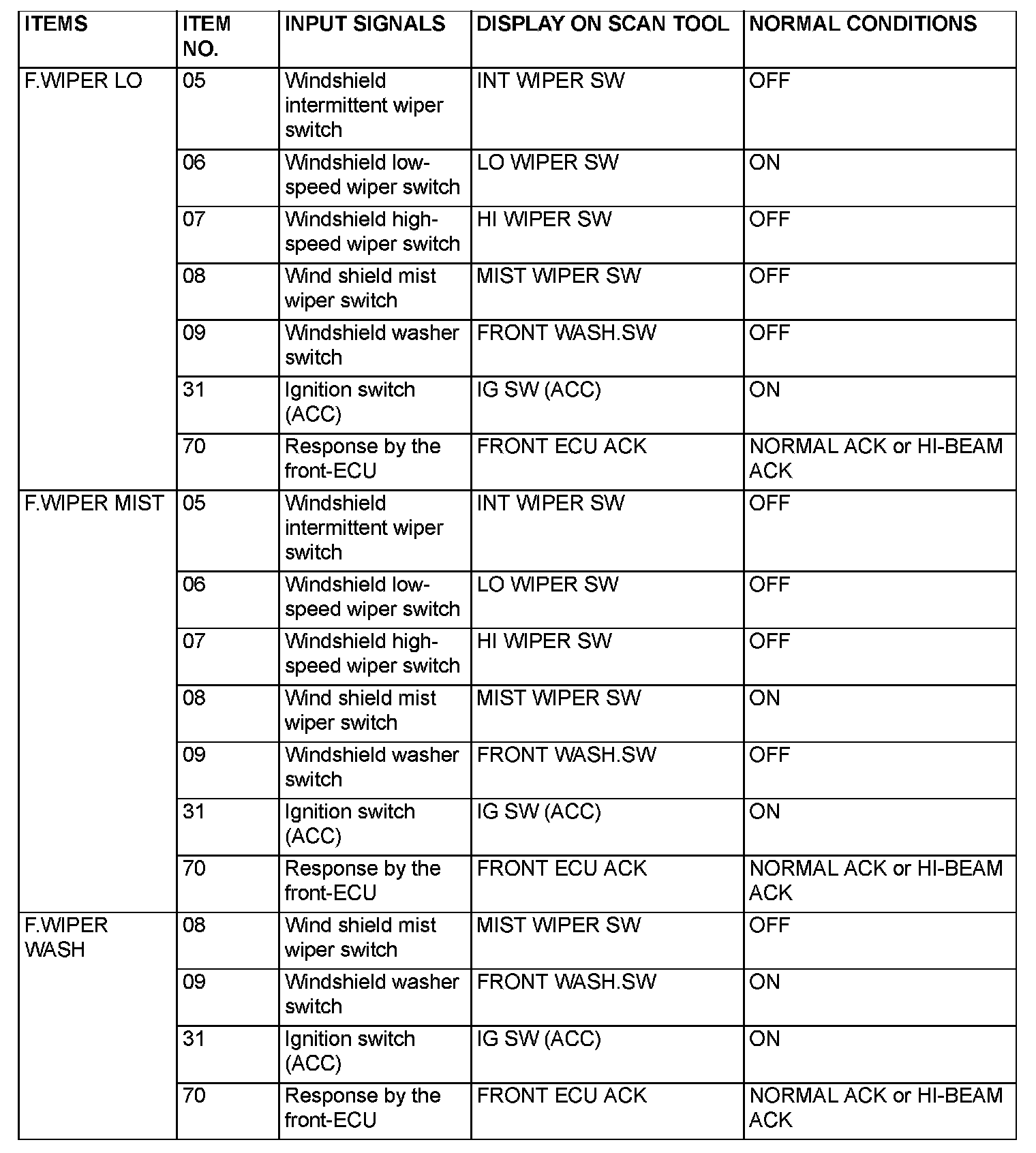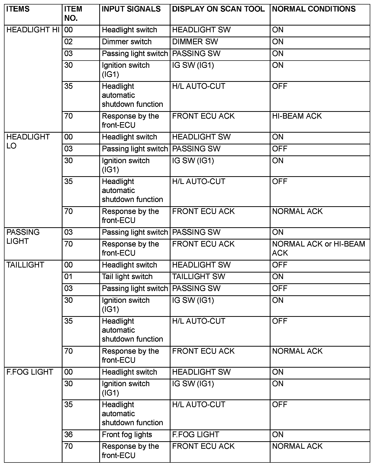 NOTE: When checking the input signals (off, tail, low-beam or high-beam), turn the ignition switch to the "ON" position in order to disable the headlight automatic shutdown function. However, the headlight operation does not depend on the ignition switch positions, the scan tool does not display the title "IGNITION SWITCH".