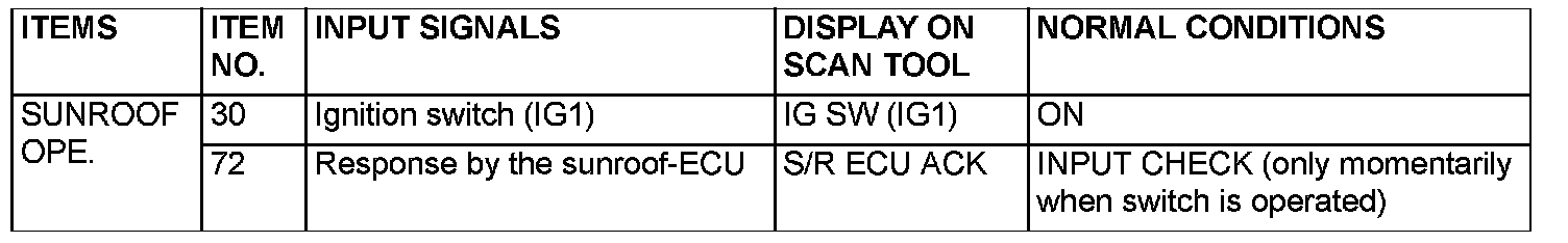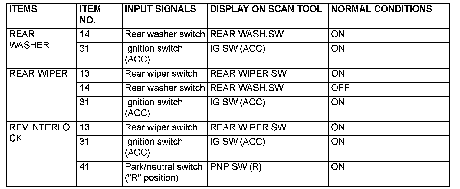 For checking item "HI (High-beam)", the scan tool displays "OFF" on the item No. 2 "Dimmer SW" when the headlights are at high-beam. Therefore, the scan tool should display "ON" momentarily when the dimmer switch is operated.
