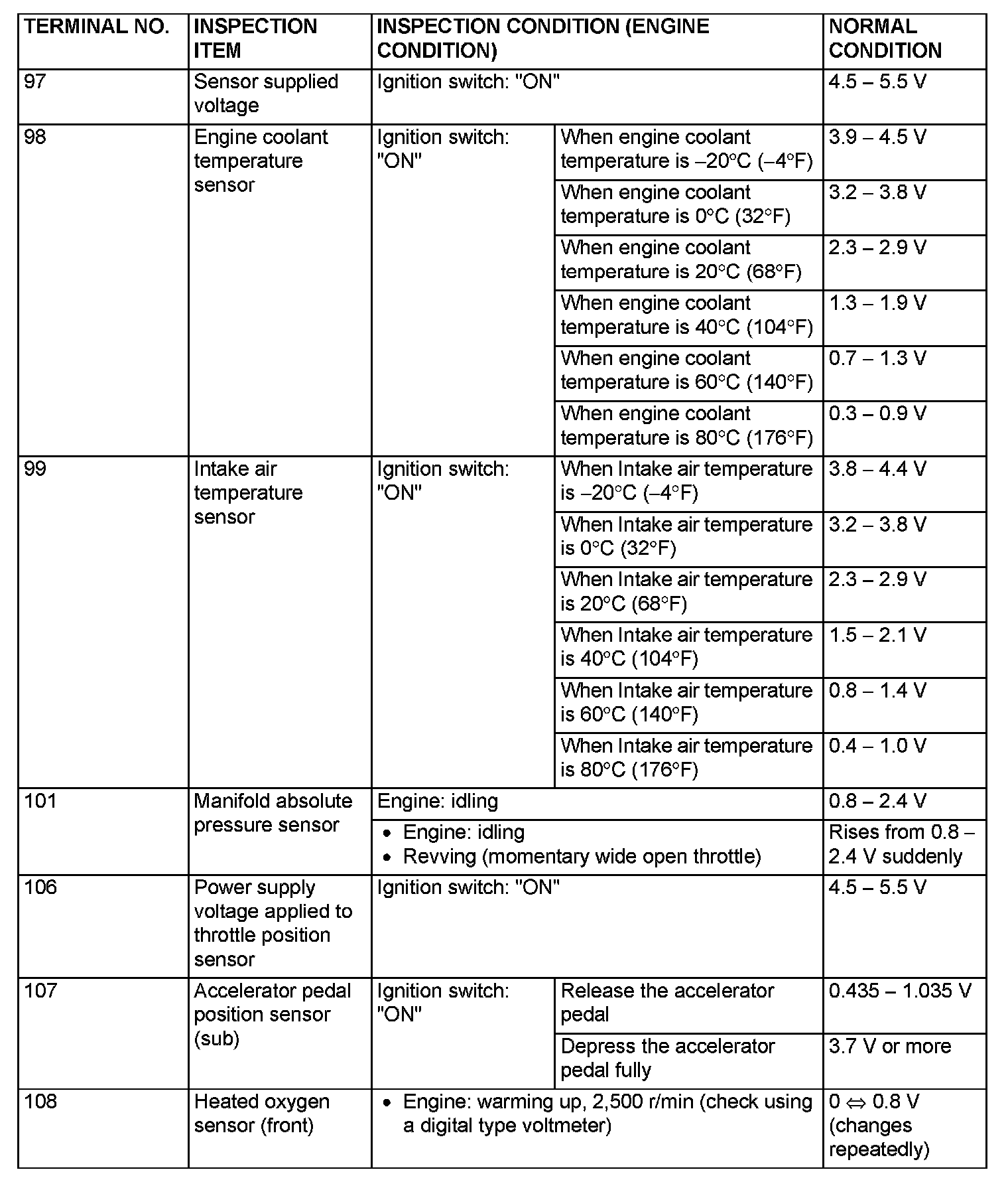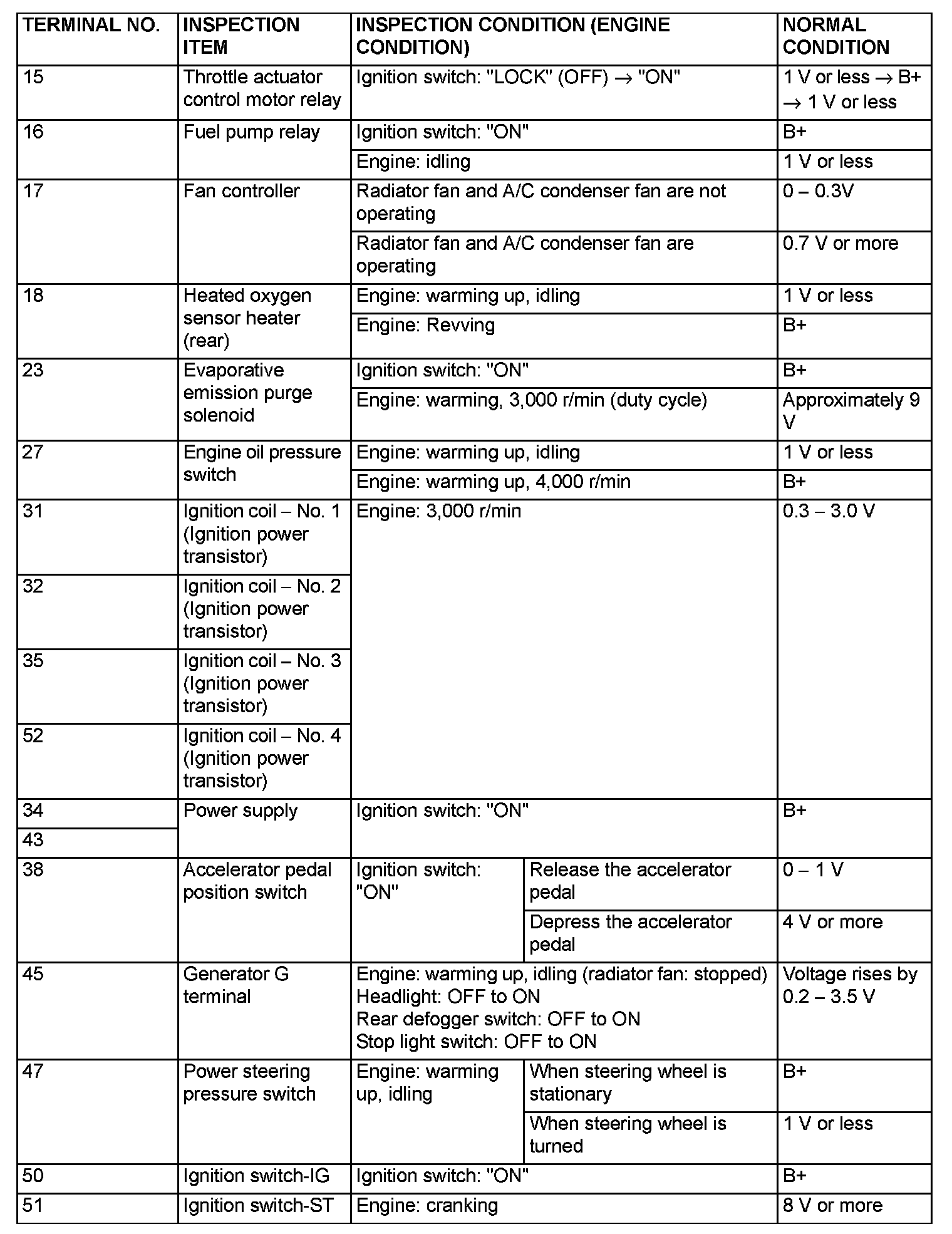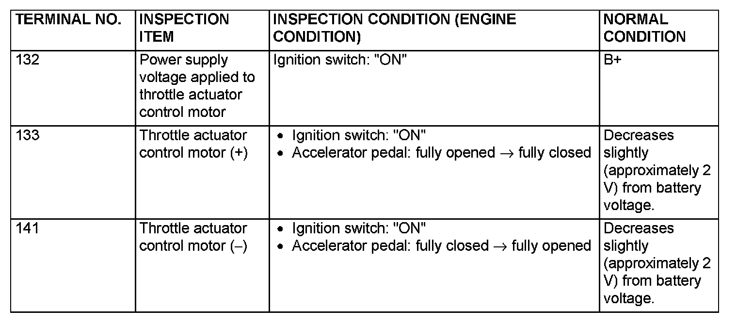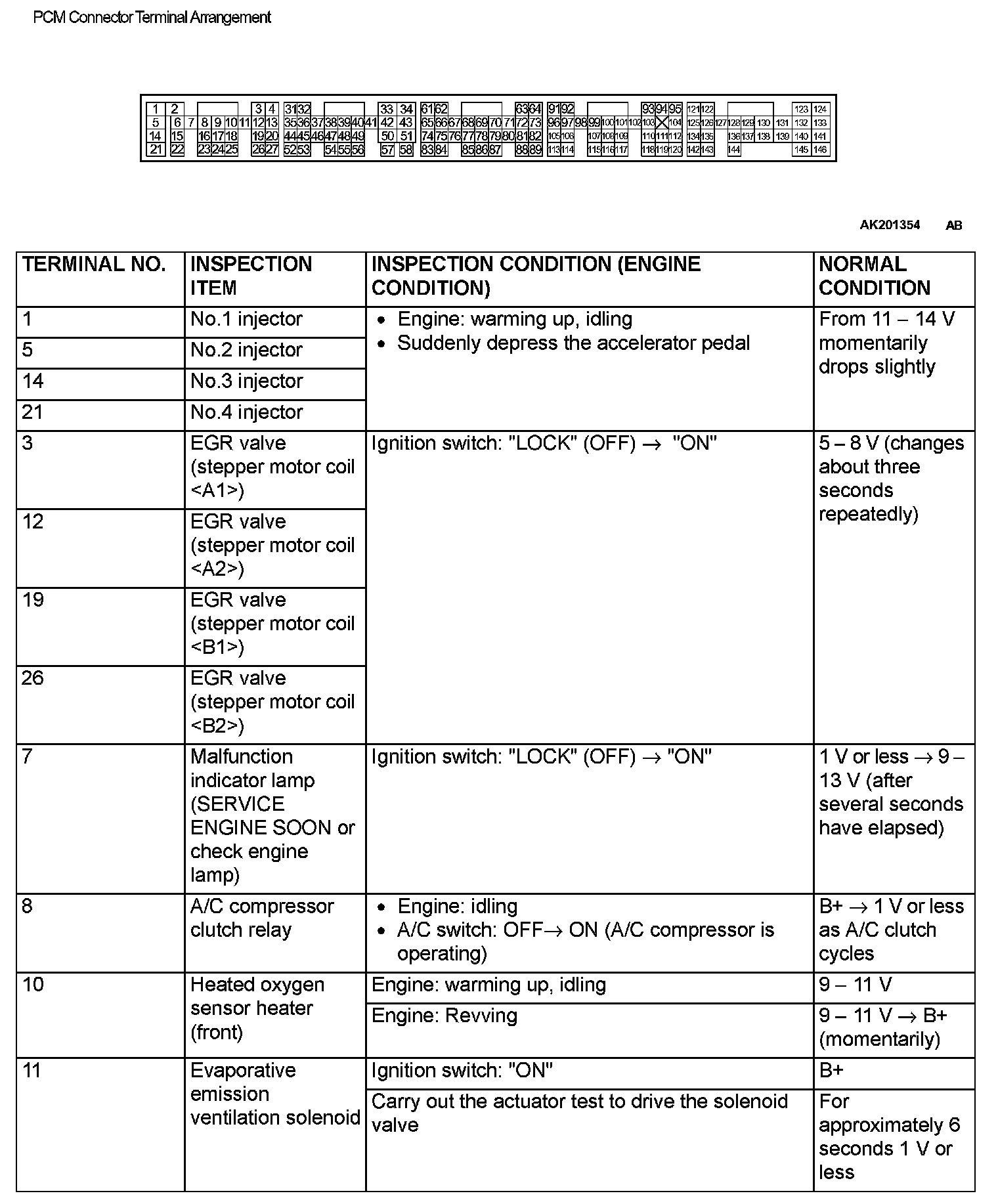 TERMINAL VOLTAGE CHECK CHARTPCM Connector Terminal Arrangement Part 1:
