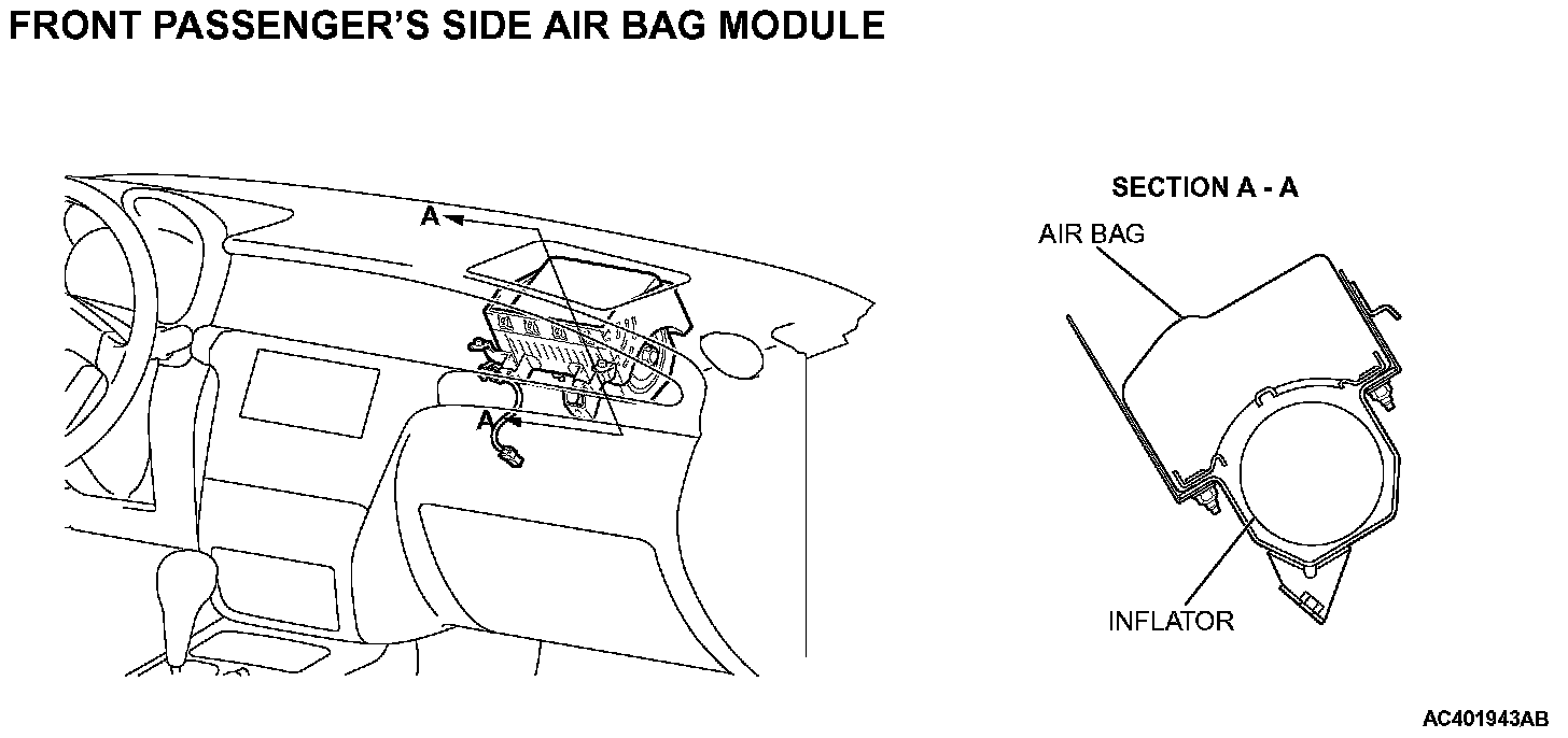 FRONT PASSENGER'S SIDE AIR BAG MODULECAUTION: Improper services cause the sudden operation of front passenger's air bag module or the system to be inoperative. Do not disassemble or tamper with the air bag module to prevent the serious injury.