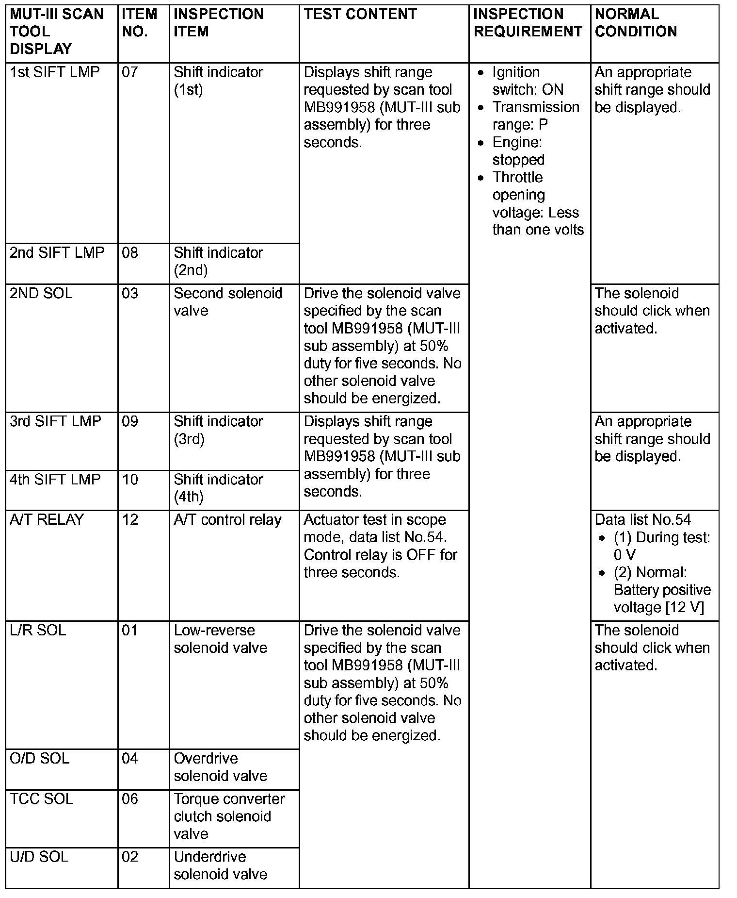 Actuator Test Reference Table