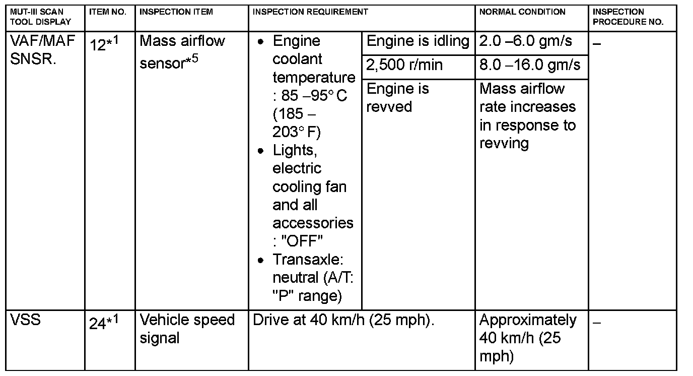 NOTE: *5: In a new vehicle [driven approximately 500 km (311 mile) or less], the mass airflow sensor output value is sometimes 10% higher than the standard value.