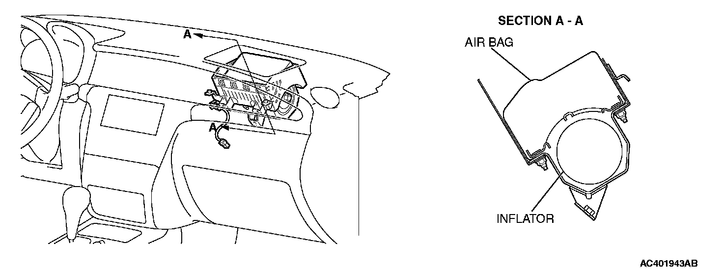 The front passenger's air bag module consists of an air bag, inflator, module cover (incorporating the instrument panel pad), and their fasteners.